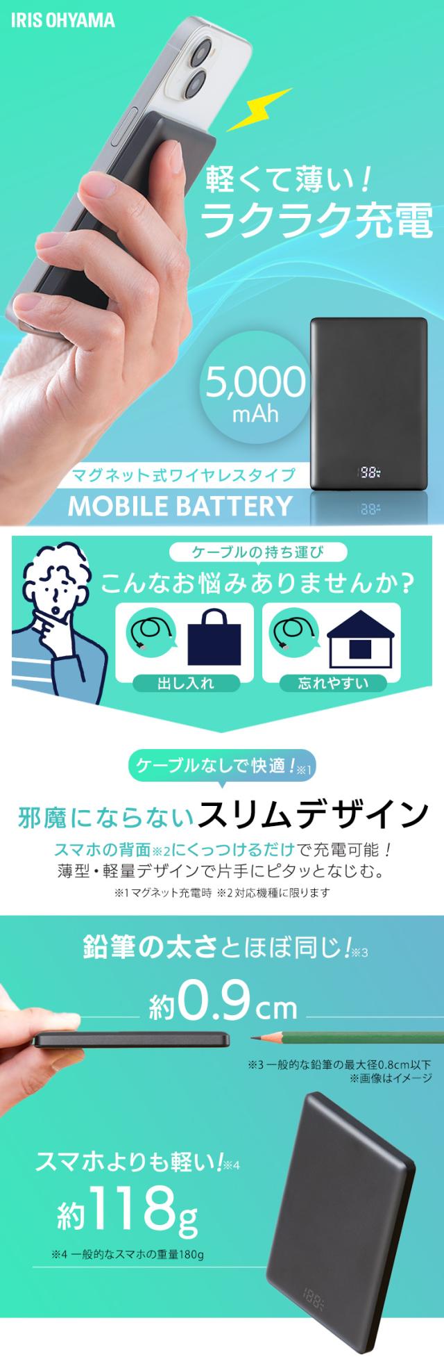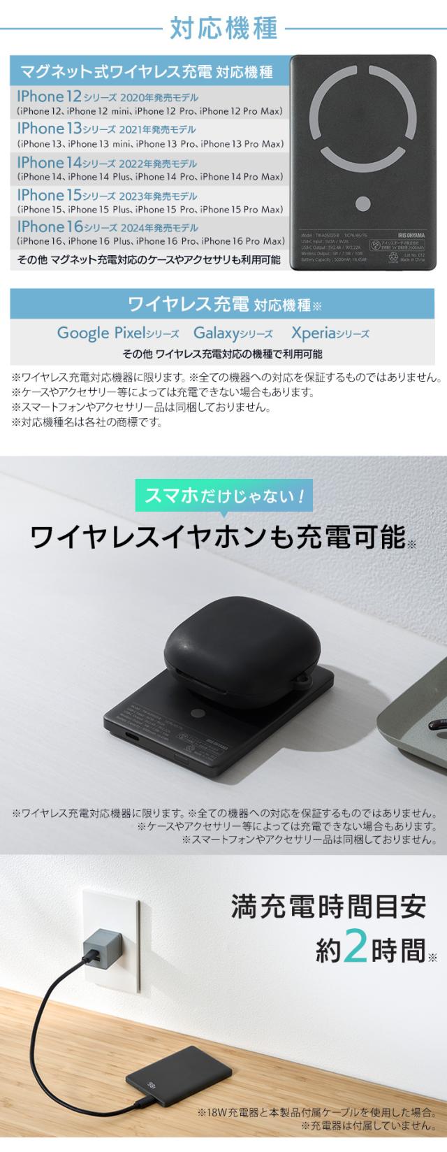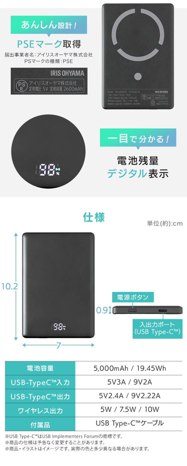 モバイルバッテリー 小型 軽量 5000mAh 薄型 ワイヤレス 充電器 マグネット MagSafe対応 USB Type-C ケーブル付属 スマホ 約1回分 充電 残量 デジタル表示 コンパクト 携帯充電器 バッテリー ブラック TW-A05020-B アイリスオーヤマ * 送料無料