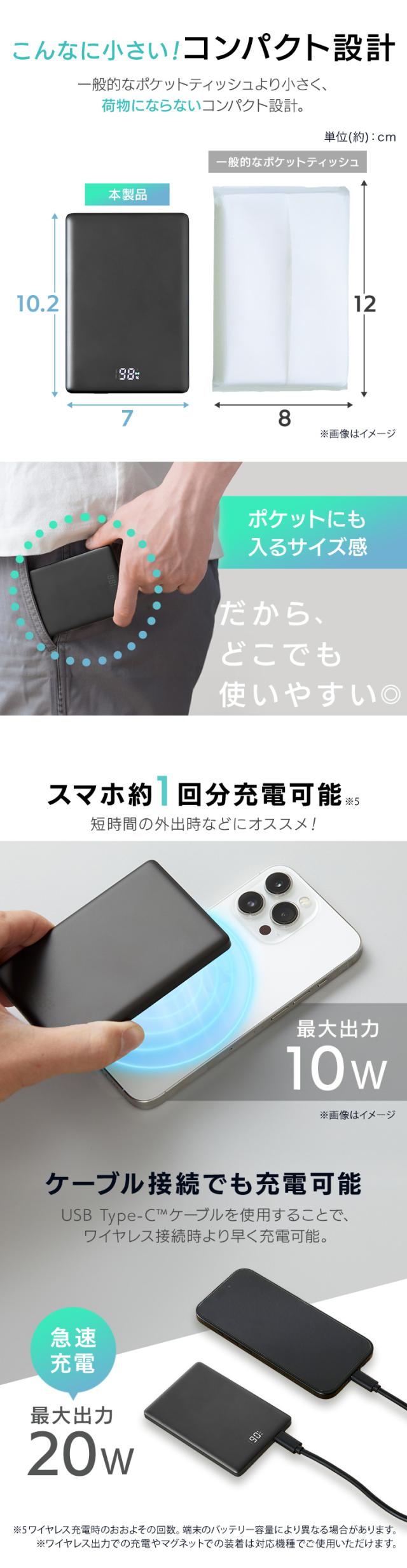 [検索用:モバイルバッテリー 軽量 小型 薄型 USB Type-C 5000mAh ワイヤレス マグネット MagSafe対応 スマホ 約1回分 充電 残量 デジタル表示 コンパクト バッテリー 充電器 ブラック 4967576775540]