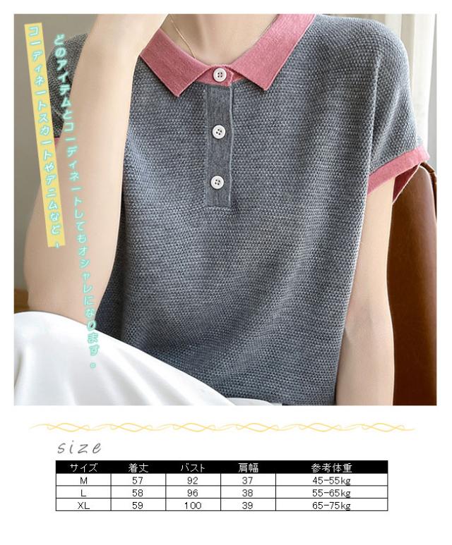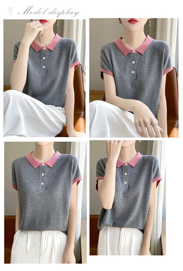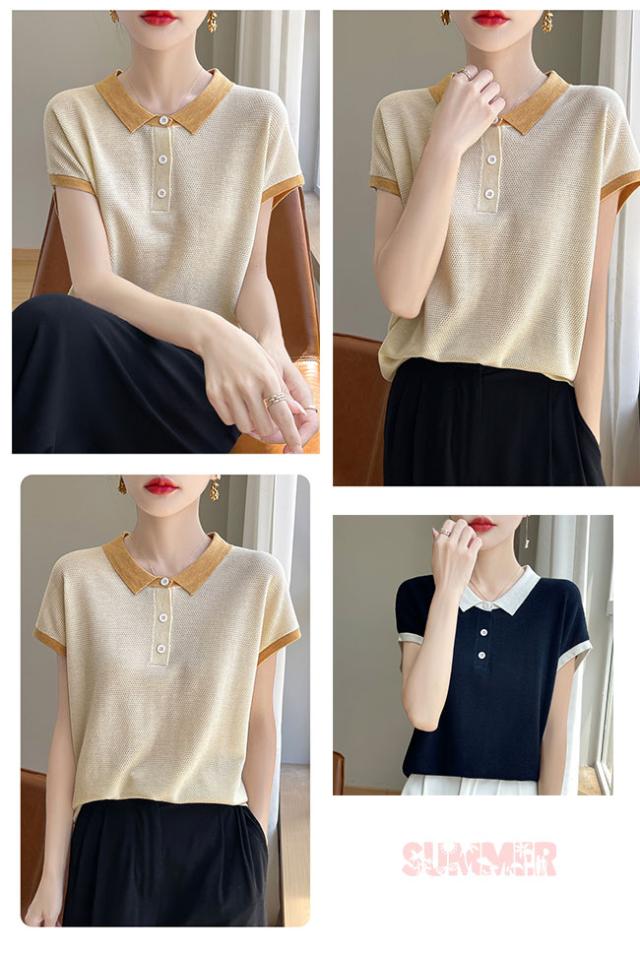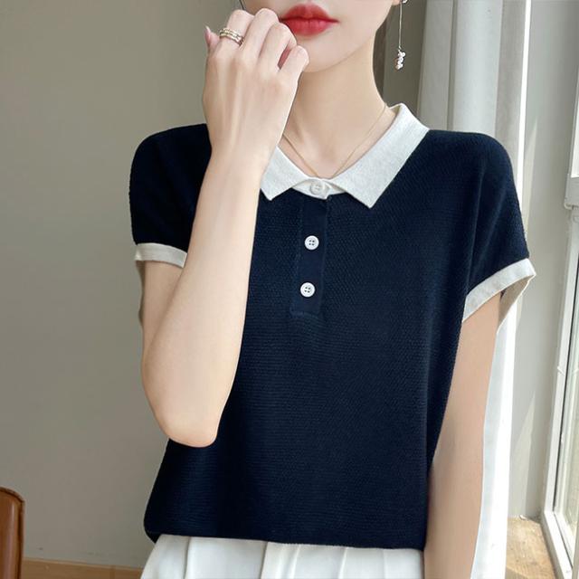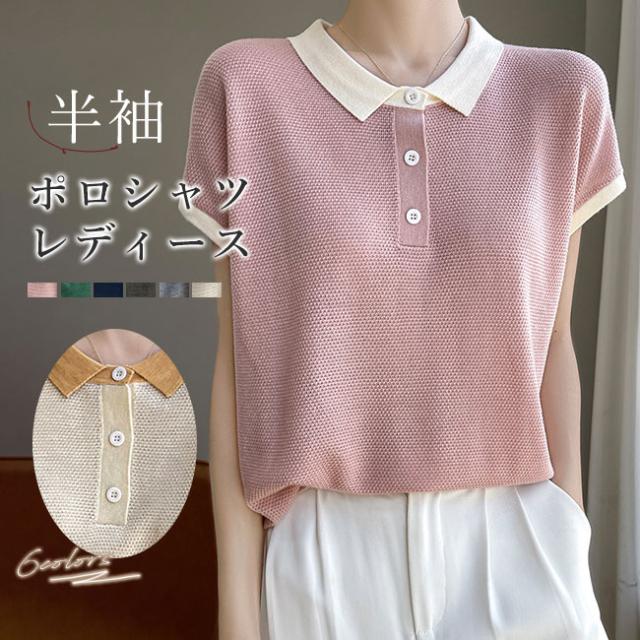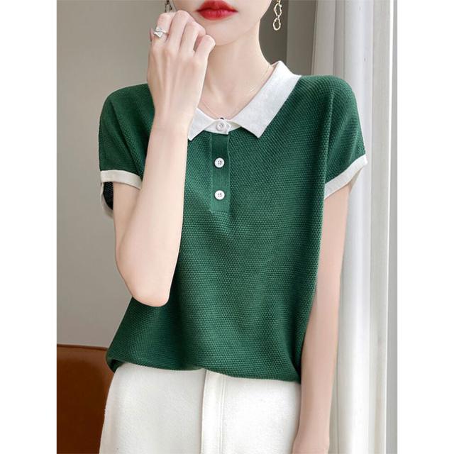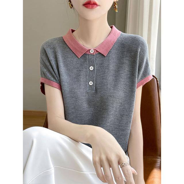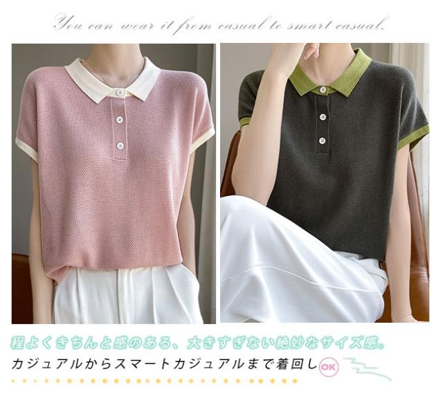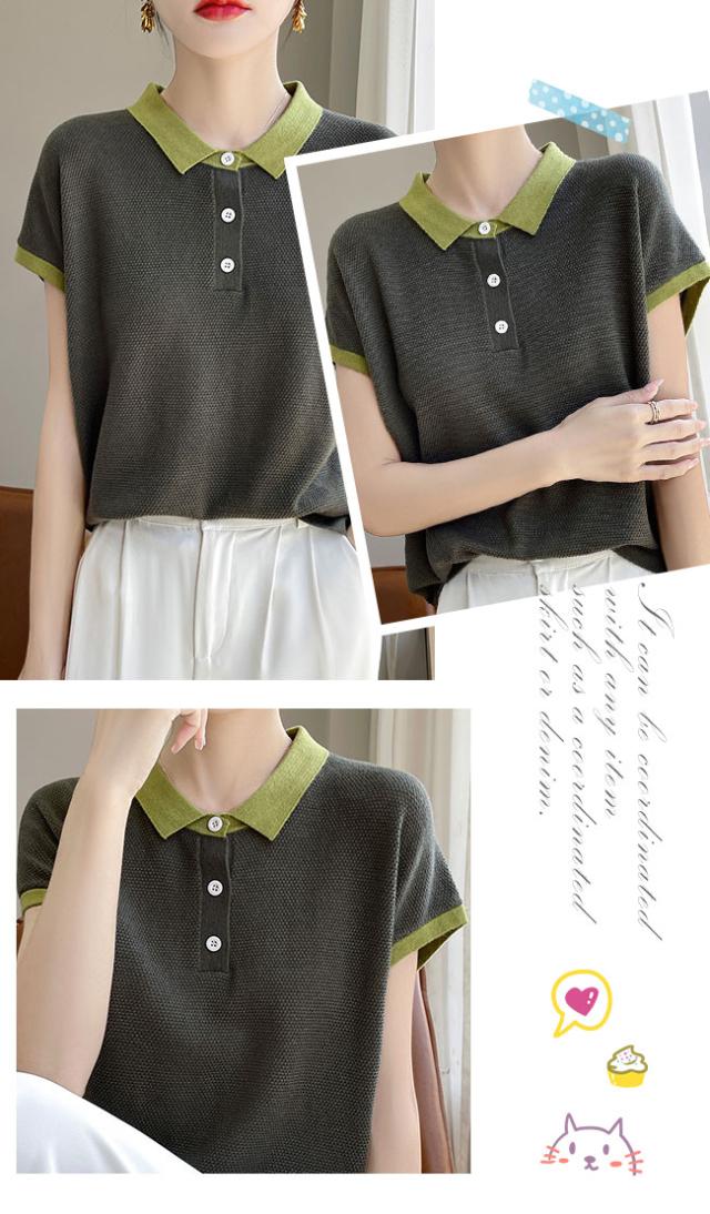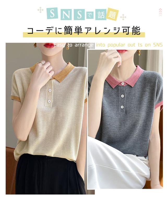 ポロネック パッチワーク 韓国風 半袖 レディース 夏新作 通気性 薄手ニット 高級感 着回しTシャツ
