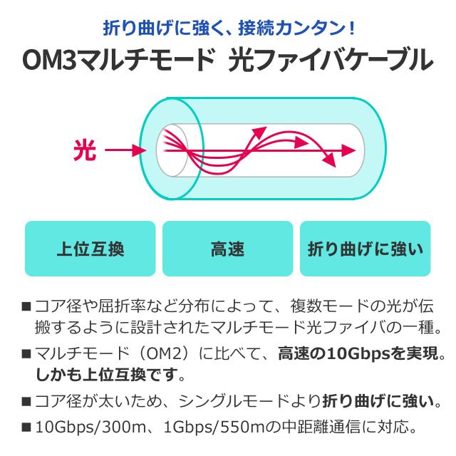 ●10GBASE-SR/SW規格伝送に準拠する10ギガビット高速通信が可能なマルチモードOM3仕様準拠の光ファイバーケーブルです。●データセンターなどにおいて10GBASE-Sの長距離通信(最長300m)を行う場合に最適です。