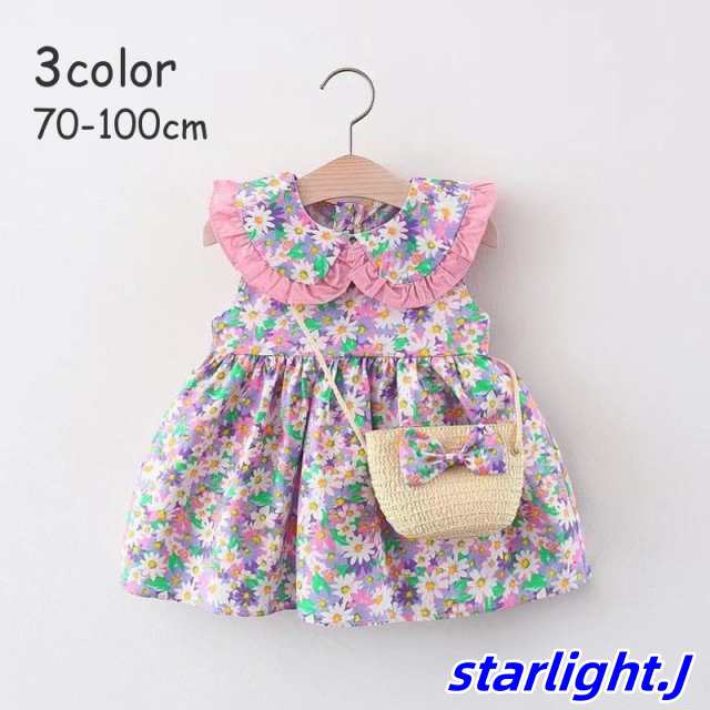 ワンピース ベビー 赤ちゃん キッズ 子供 子ども 子供服 女の子 ポシェット付き ノースリーブ 袖なし 夏 花柄 襟付き フリル かわいい ガーリー