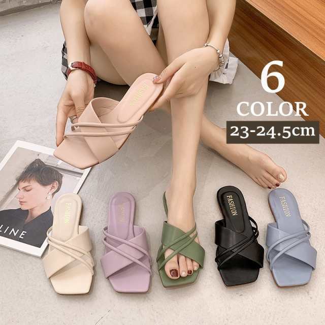 ミュール レディース サンダル クロス ぺたんこ パステルカラー フェミニン スクエアトゥ かわいい おしゃれ シンプル きれい