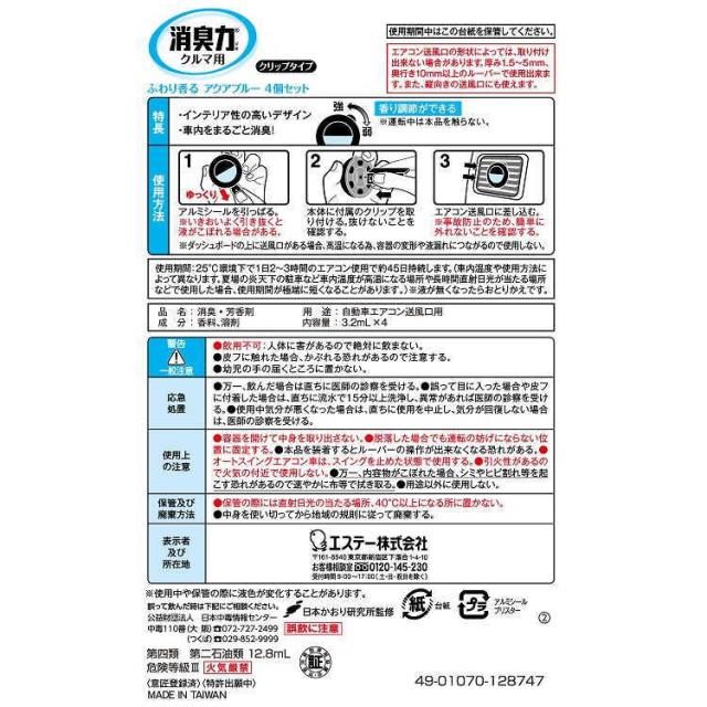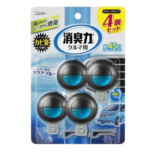 消臭力 クルマ用 4個セット エステークリップタイプ 約45日 アクアブルー 香りの調節機能付き 芳香消臭 車 芳香剤 リキッドタイプ ニオイ 消臭 エアコンのカビ臭にも効く!送料無料 追跡あり