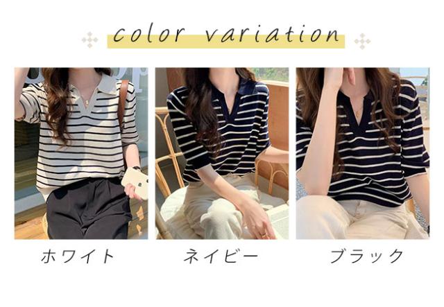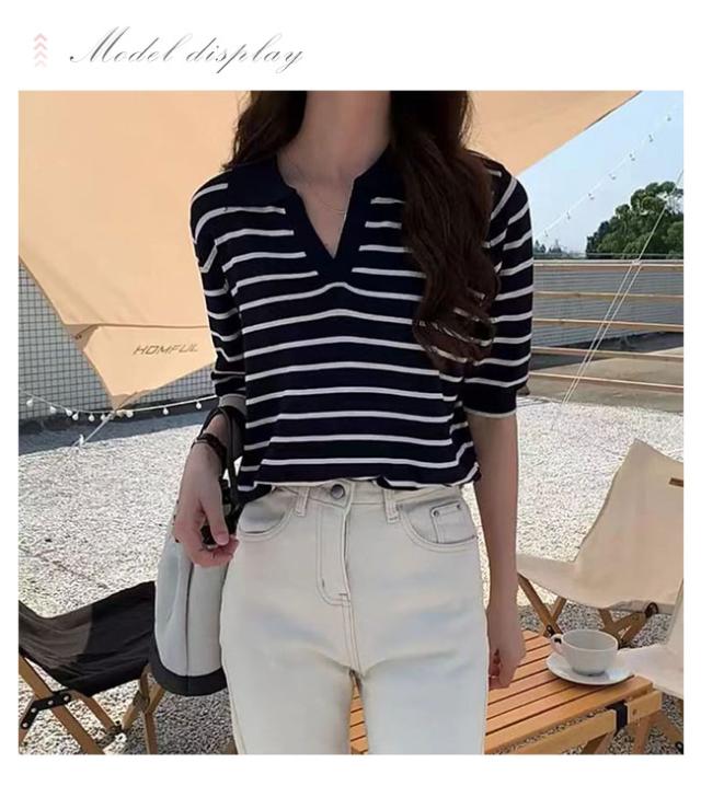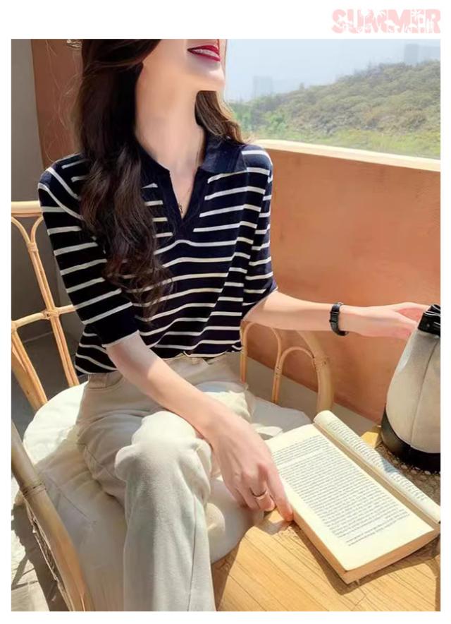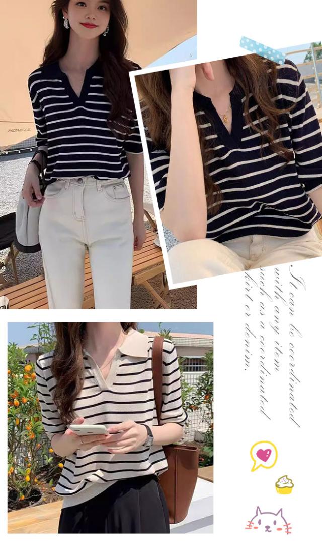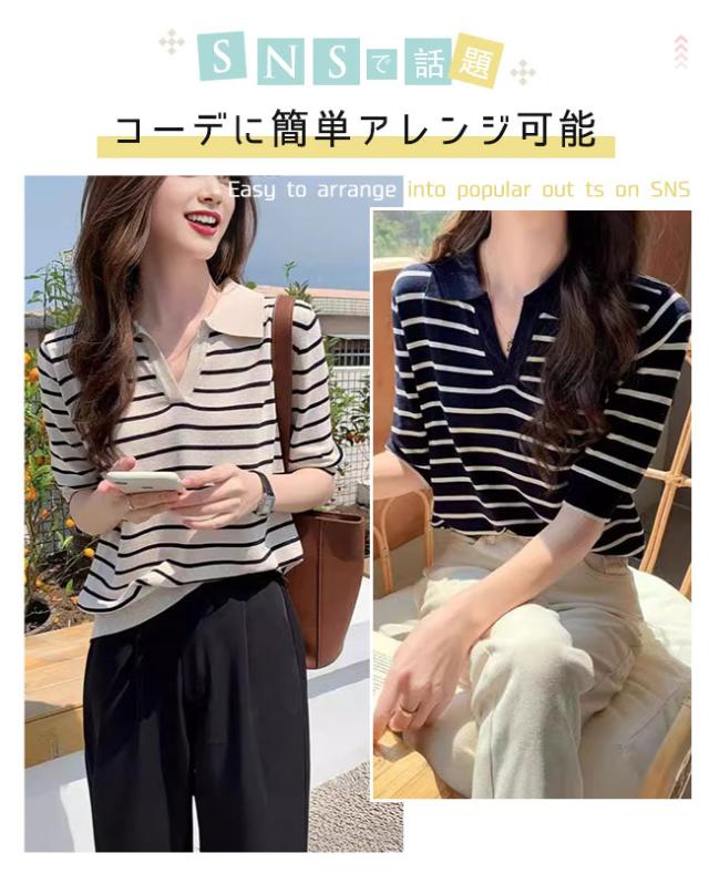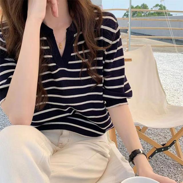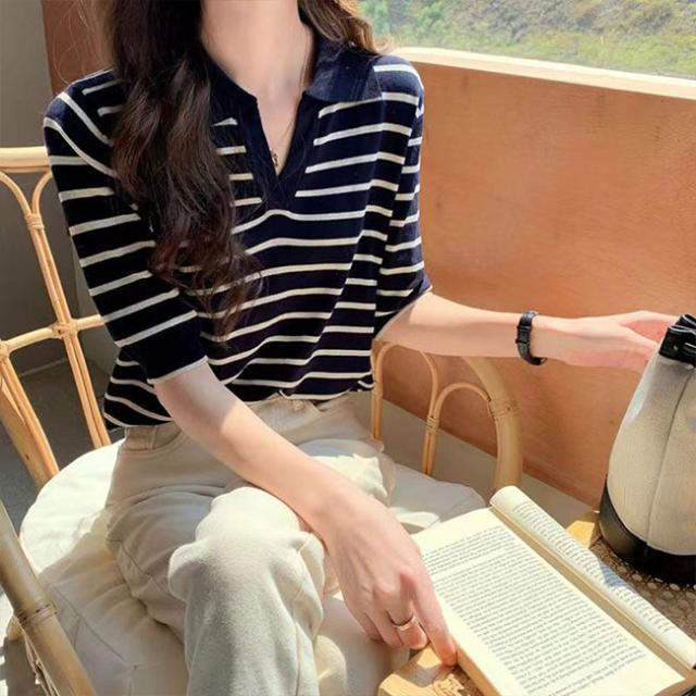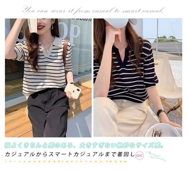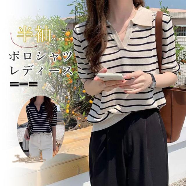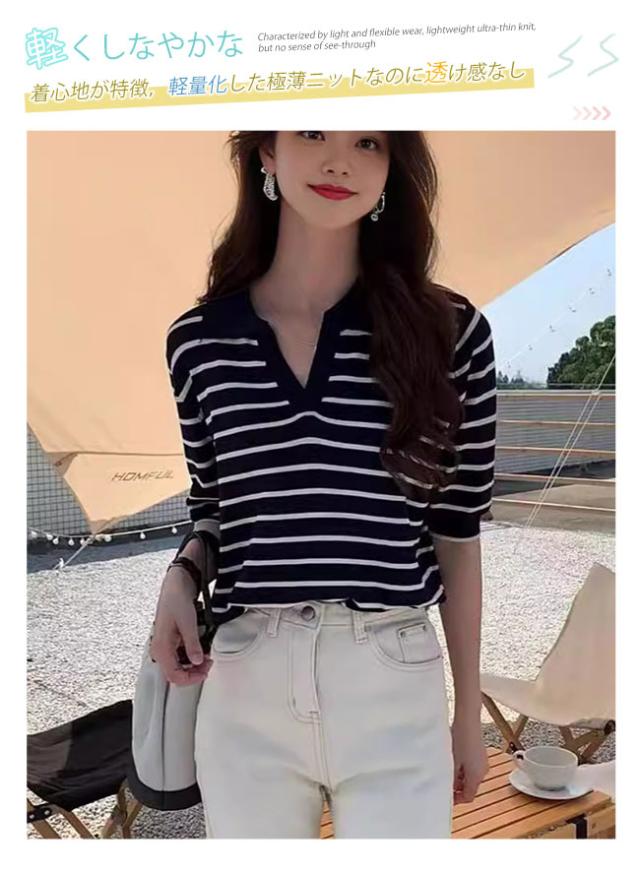 夏の新作 ポロネック ストライプ ニットTシャツ レディース シンプル 韓国風 Vネック ゆったりトップス