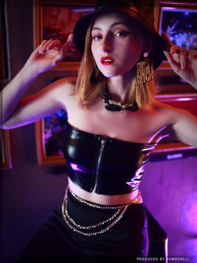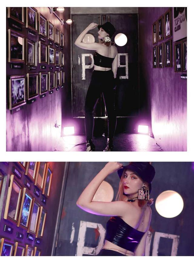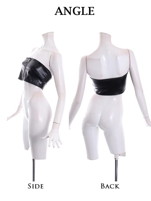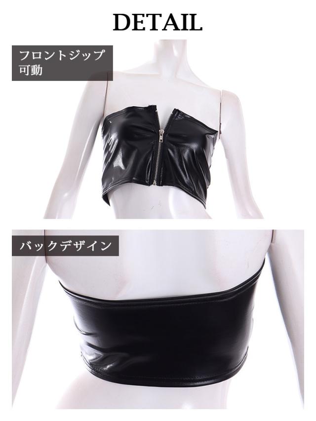 ☆ダンスのステージで魅力を最大限に引き立てるフェイクレザーのベアトップビスチェは、フロントジッパーで着脱もラクラク♪