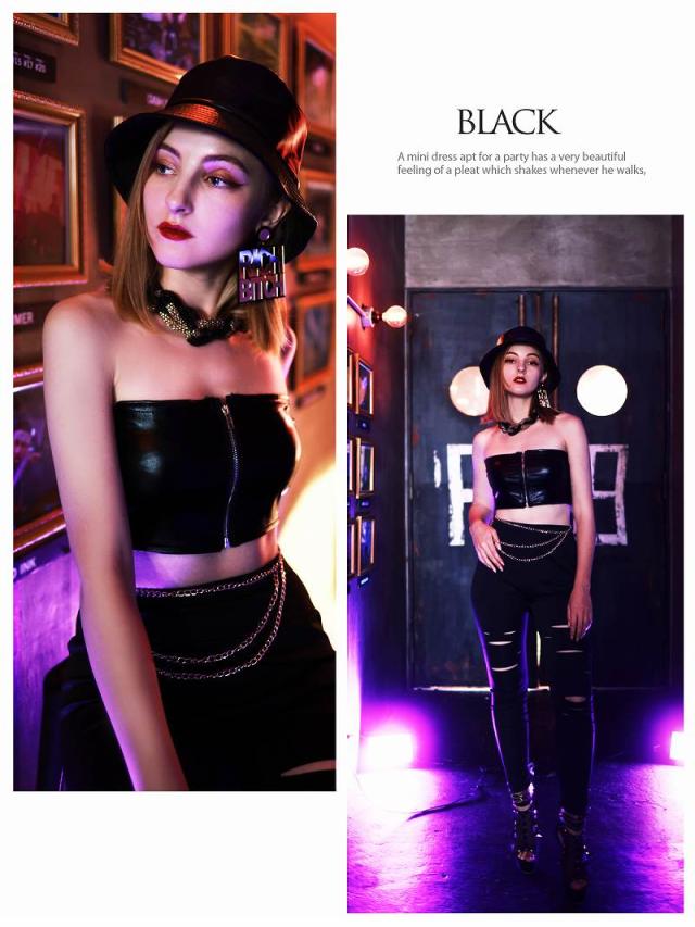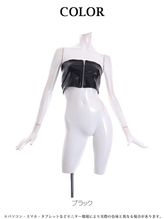 ☆黒の無地でかっこよくキマるフェイクレザーベアトップは、フロントジッパー仕様で誰よりもセクシーにキマるから周りの視線を集めちゃうこと間違いなし!