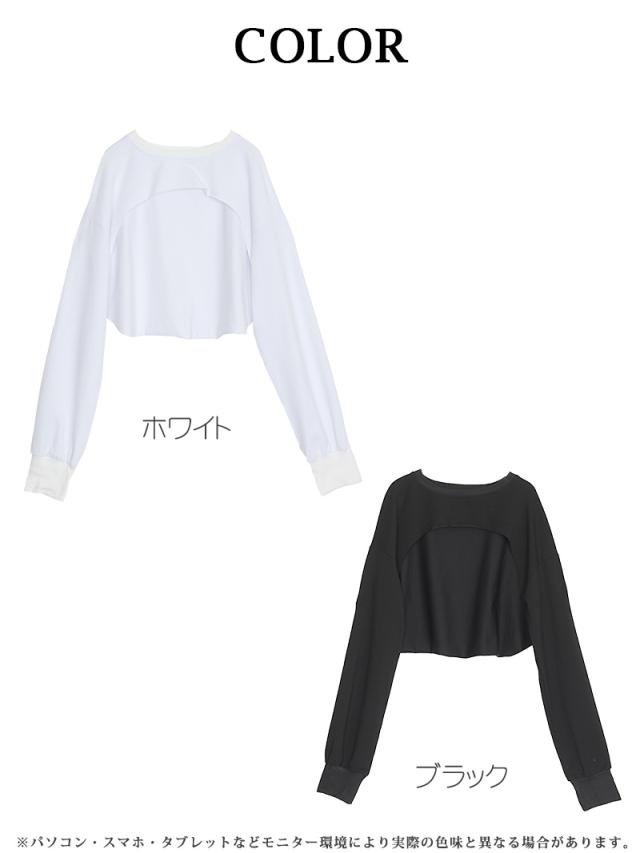 ☆バストからお腹にかけて大胆に露出させるデザインなのでキャミソールやビスチェやベアトップなど気分に合わせたレイヤードコーデが楽しめる長袖トレーナー。
