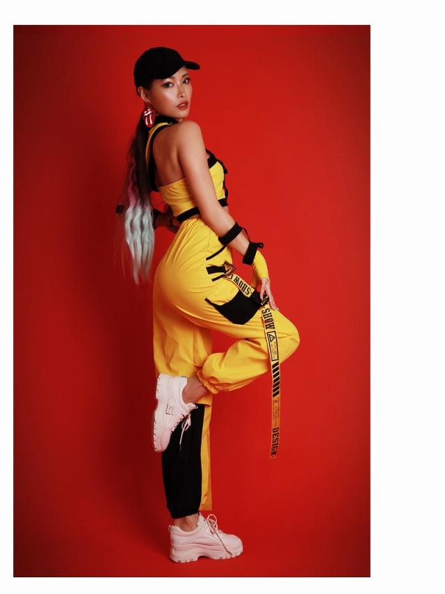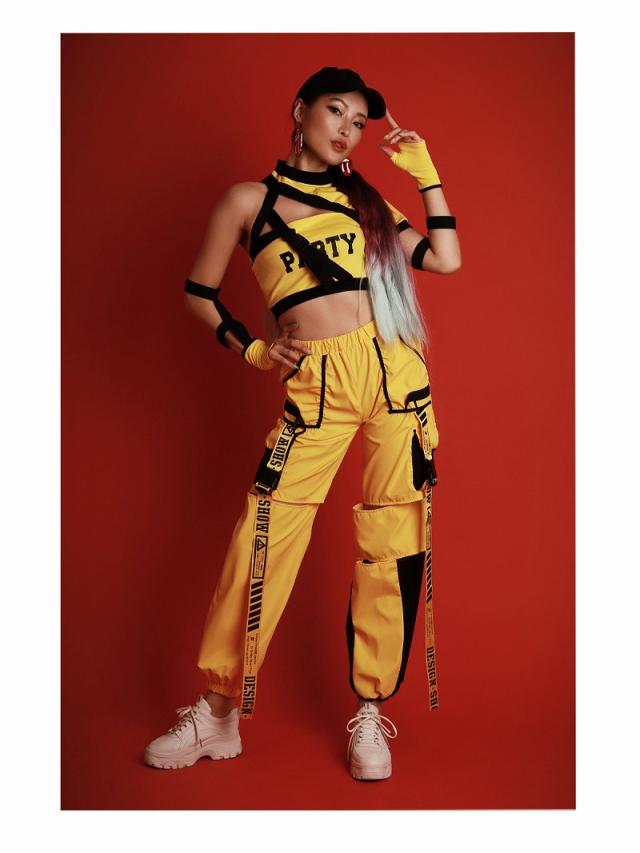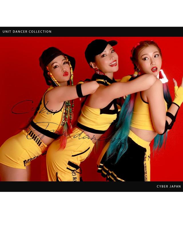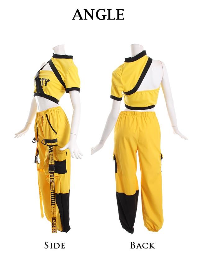 ☆お腹見せがセクシーなチョーカー付のオフショル短丈トップスと、バックルテープベルトがポイントのカットアウトパンツの3点セットアップは、大きめバックルハーネスベルトとド派手イエローブラックのバイカラーでCOOLなダンサーコーデがキマる!