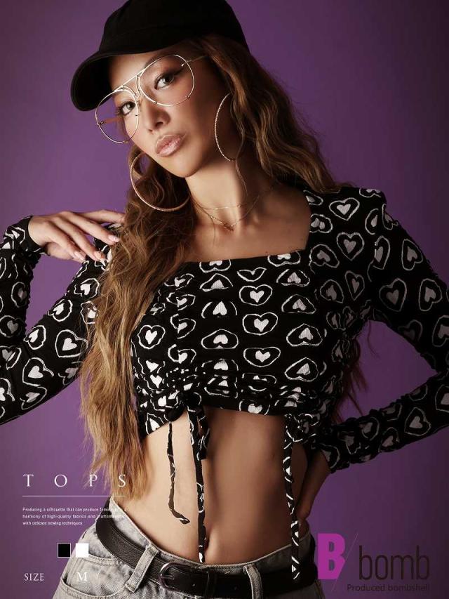 長袖カットソー Bbomb ハート柄 へそ出し シャ-リング リボン