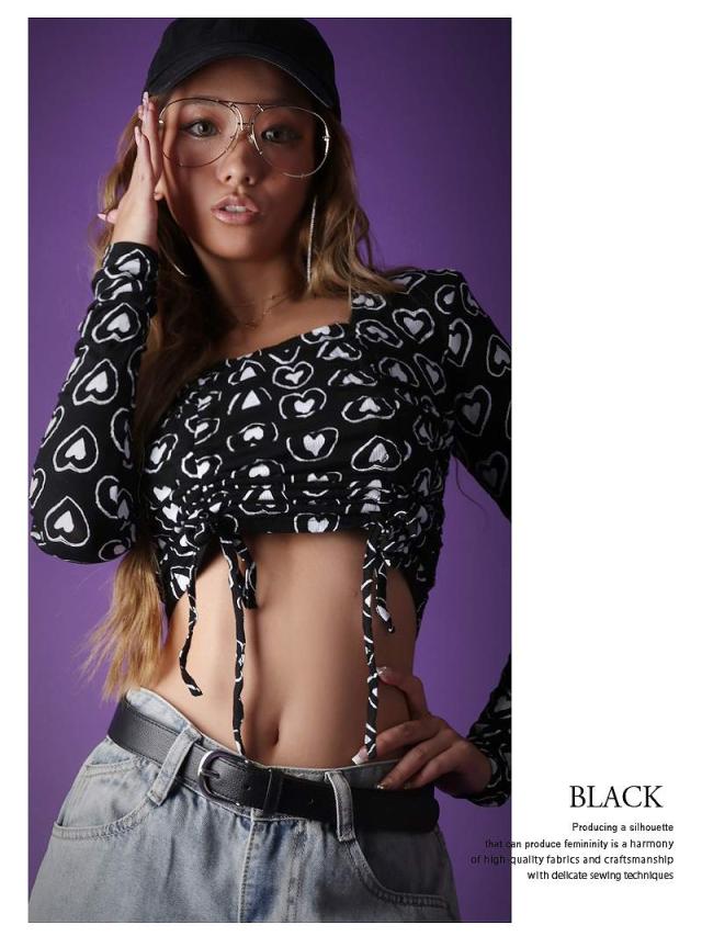 ☆へそ出しが超絶可愛くキマるアメリカンポップなギャザー入りハート柄トップス♪