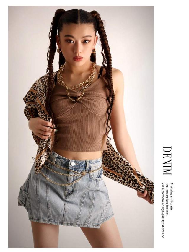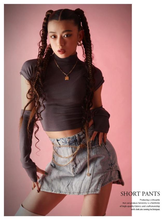 デニムのスカートズボンはハイウエストデザインでベルトループもあるからお気に入りのベルトとコーデもできる。