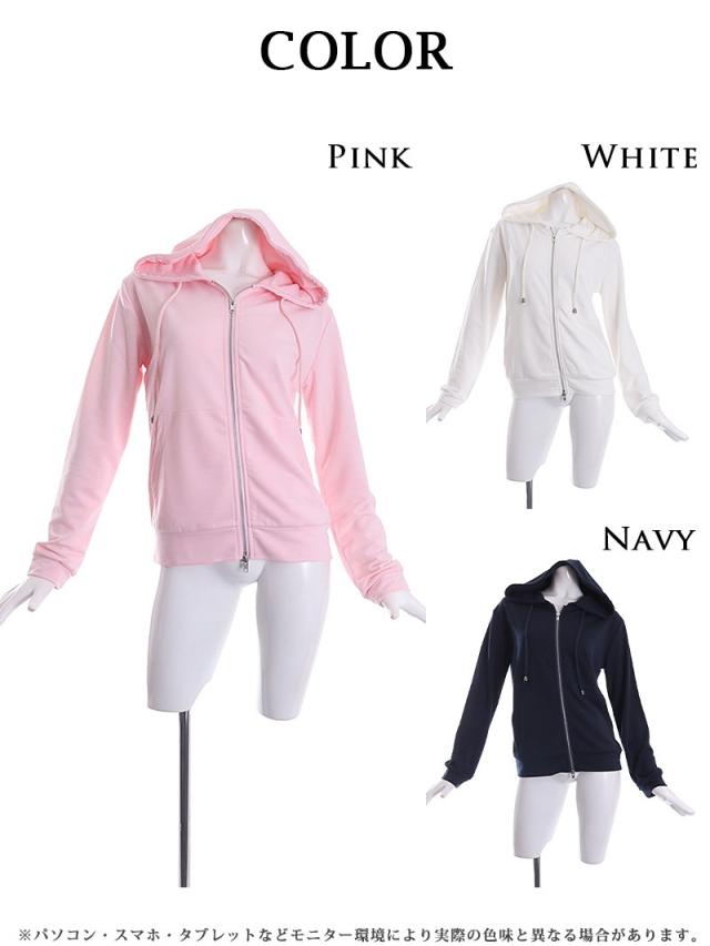 ☆程よく薄手のパーカーはさりげなくダブルジップラインなのでインナーにビスチェやブラトップなど着てお腹見せスタイルもかわいいフード付きパーカー。