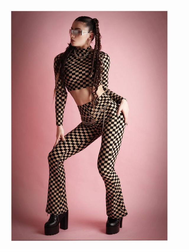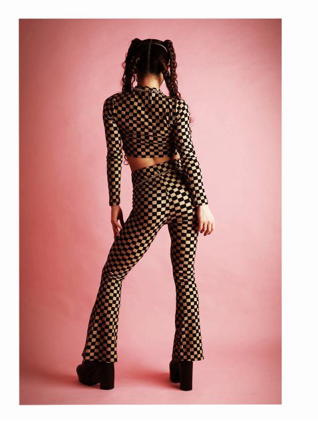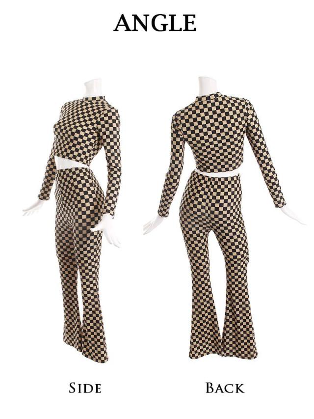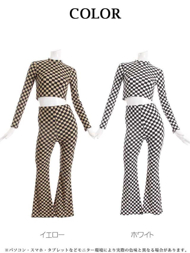 ☆ブロックチェック柄が存在感抜群!ヘソ出しショート丈長袖Tシャツ×フレアレッグロングパンツ2点セット!