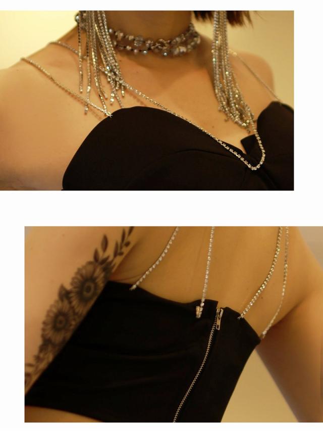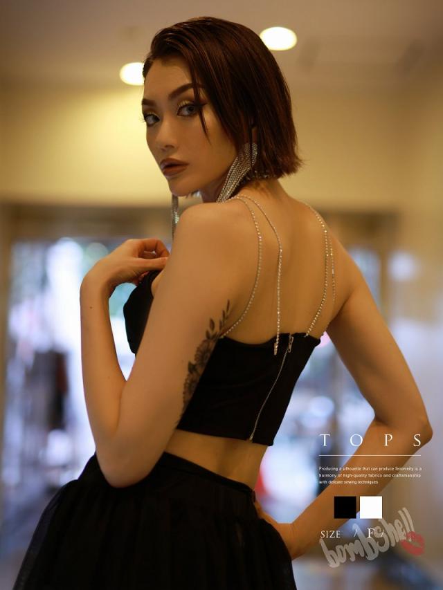 ☆キラキラ輝くラインストーンストラップが特徴のキャミソールは、カップ付きなので1枚でも着れちゃうタンクトップ。