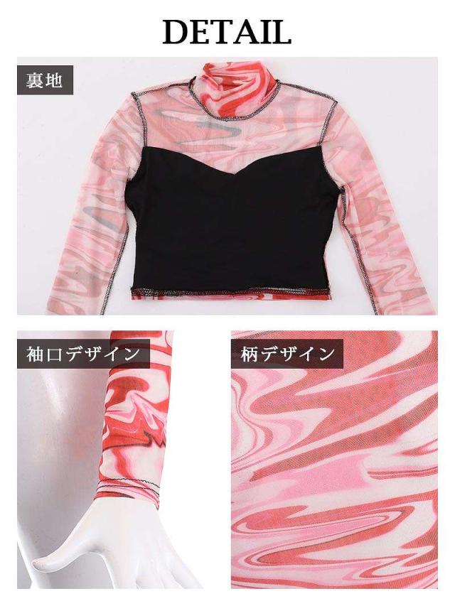 ☆セクシーさと派手さが融合した、クラブイベントやK-POPスタイルにぴったりのメッシュトップス。マーブル柄の透け感が魅力です。