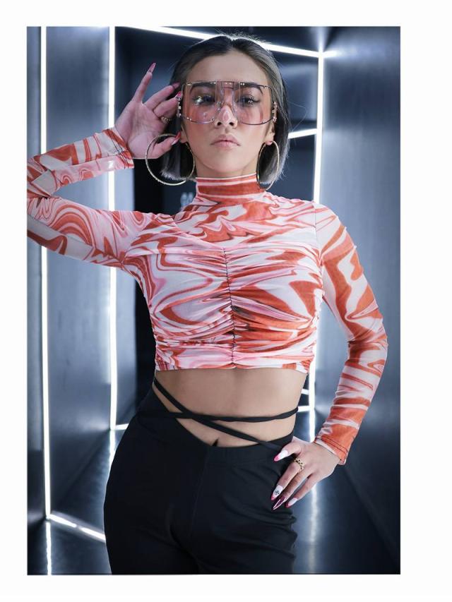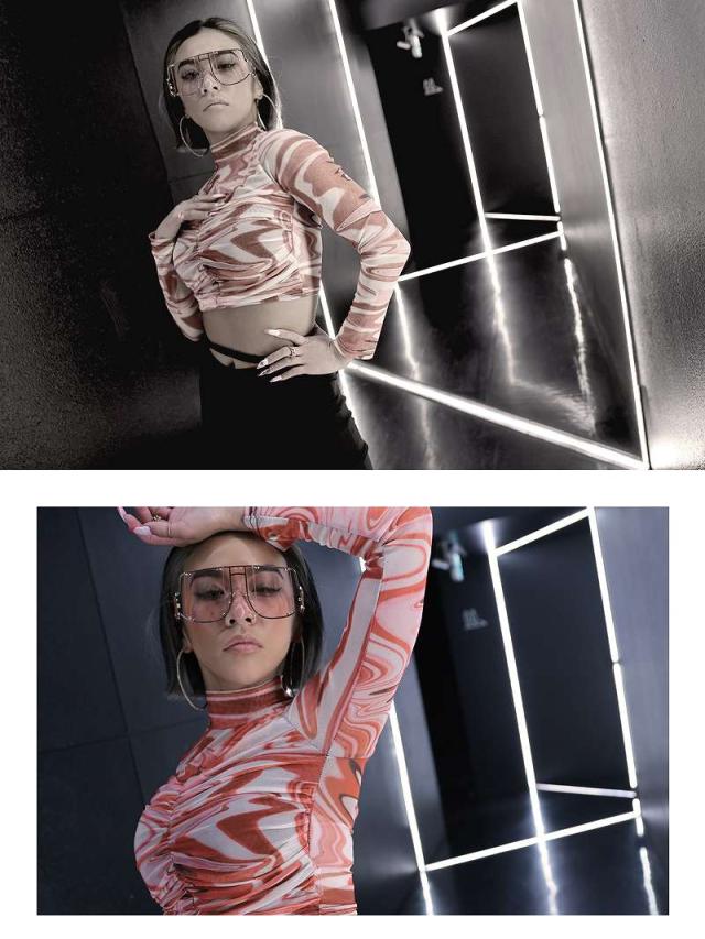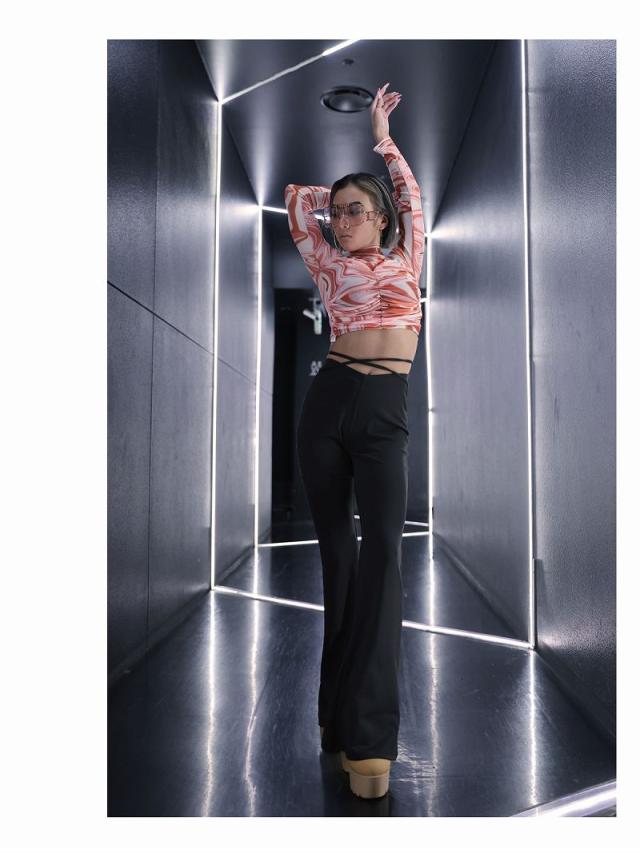 ☆長袖のメッシュトップスで、クラブイベントやダンスシーンで存在感を放つ。韓国ファッションのトレンドを取り入れて。