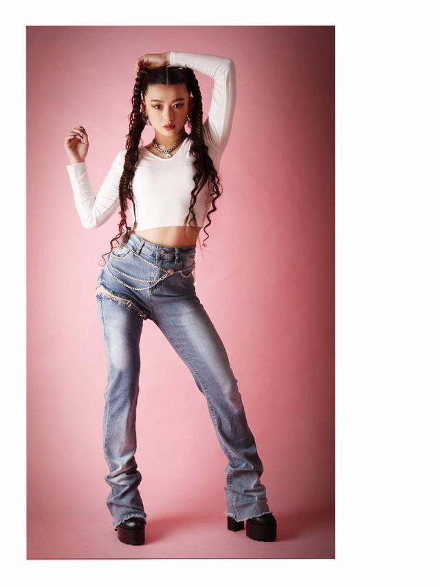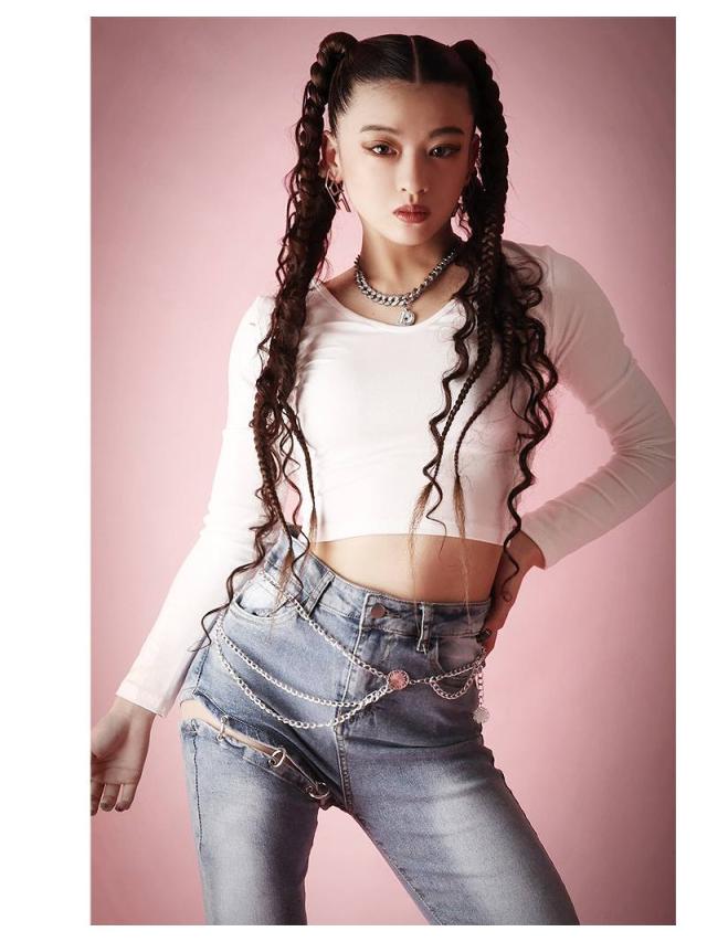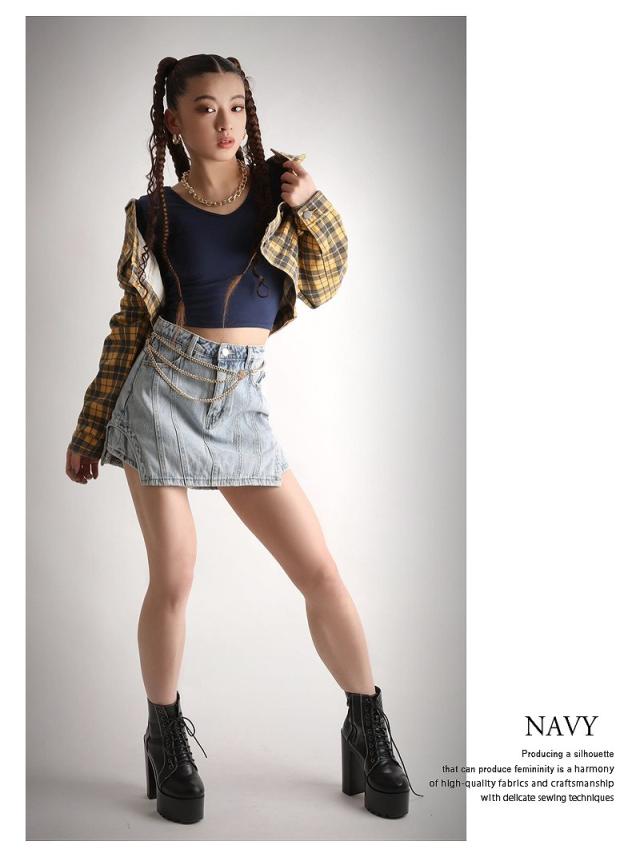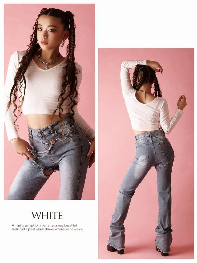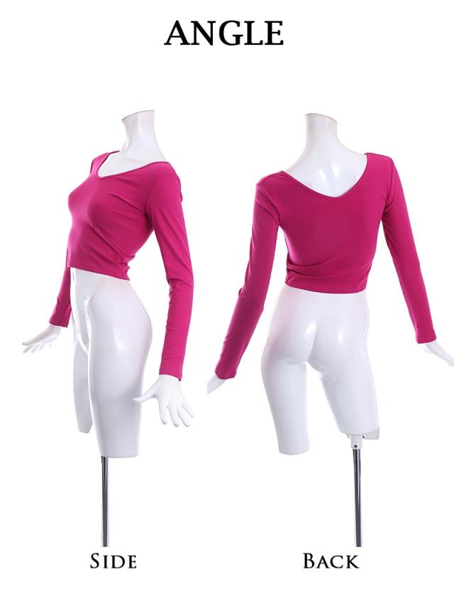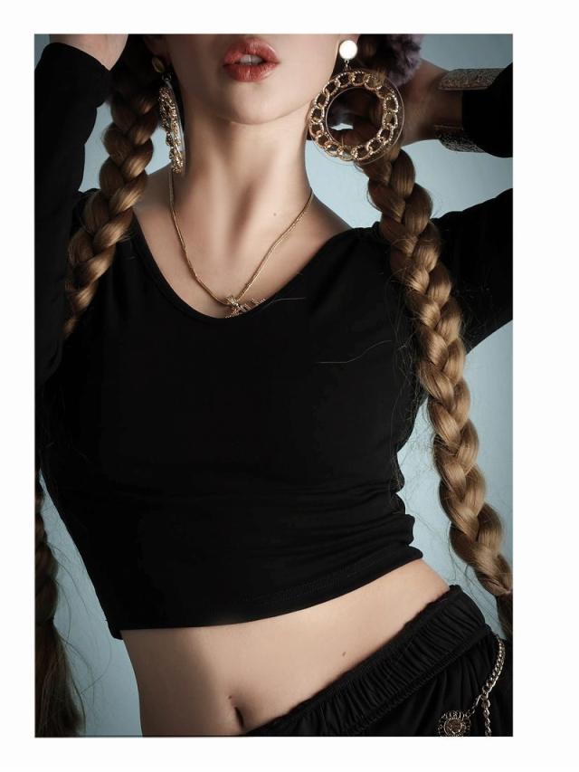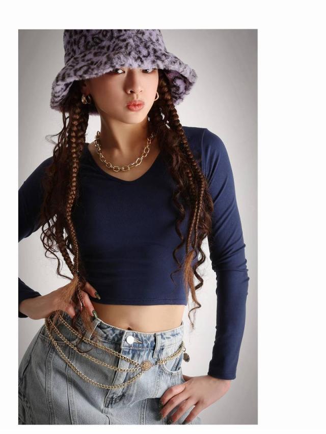 クロップド丈でお腹見せが叶う海外風無地カットソーはVネックで小顔効果も◎。