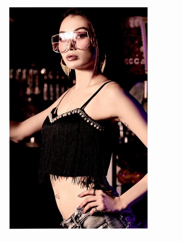 ☆ギラギラと爆発的に輝くパールビーズとラインストーンが付いた舞台映え間違いなしのフリンジキャミソールトップス。