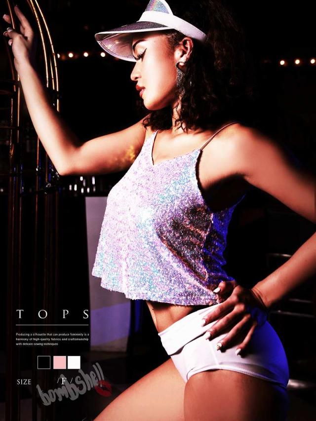 ☆ステージのライティングの光で反射し、ド派手に映えるセクシーなキラキラキャミソールはダンス衣装に最適!