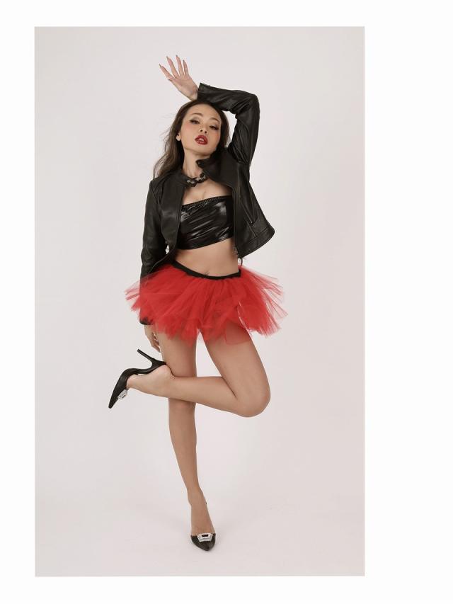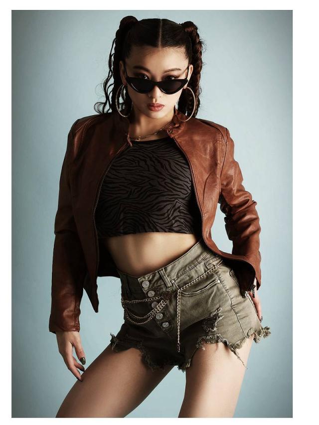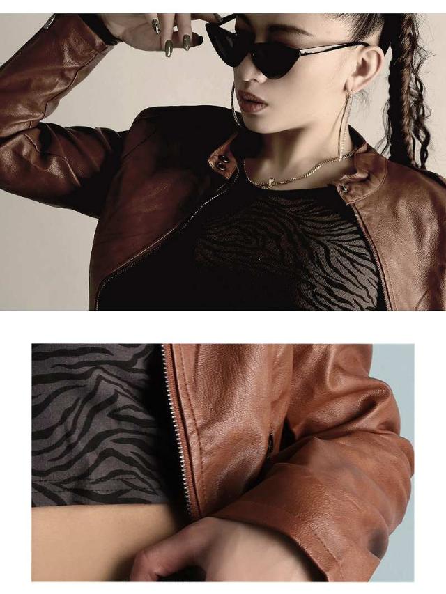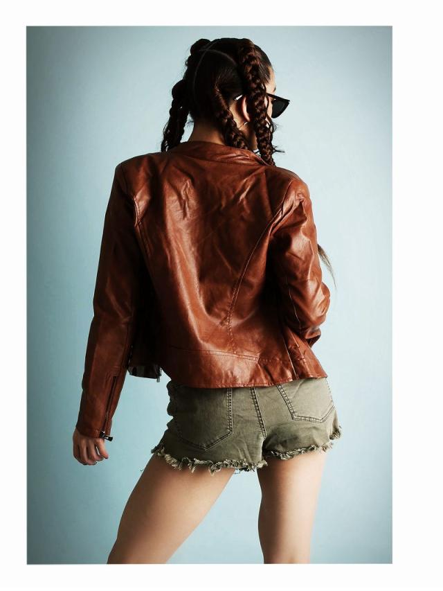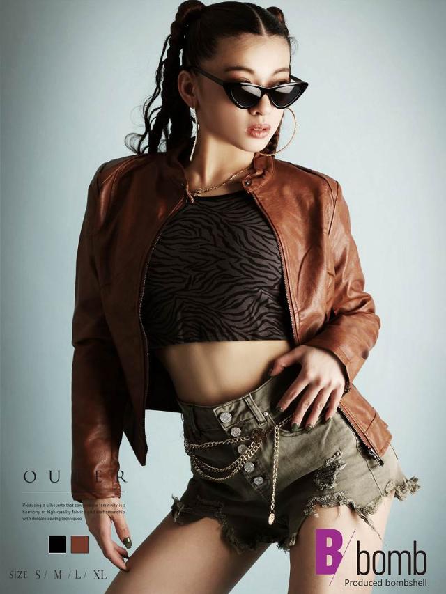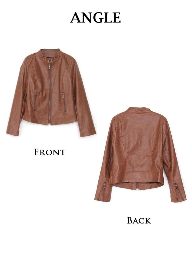 ☆ソフトで柔らかいフェイクレザー素材の落ち着いたツヤ感とシワがプチプラに見えない合皮ライダースジャケットは、ライトアウターとしてシーズンレスで使えるからおしゃれダンサーコーデに大活躍の衿なしジャケット!