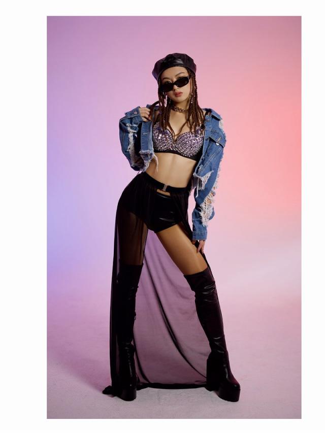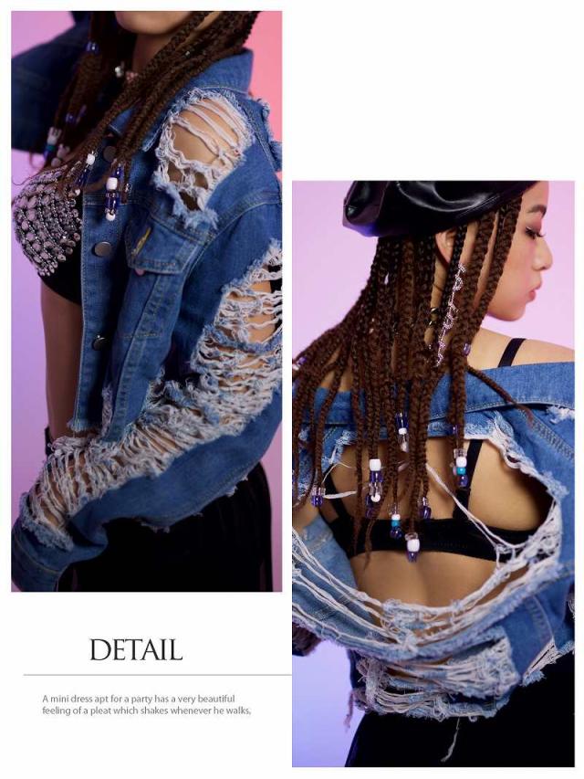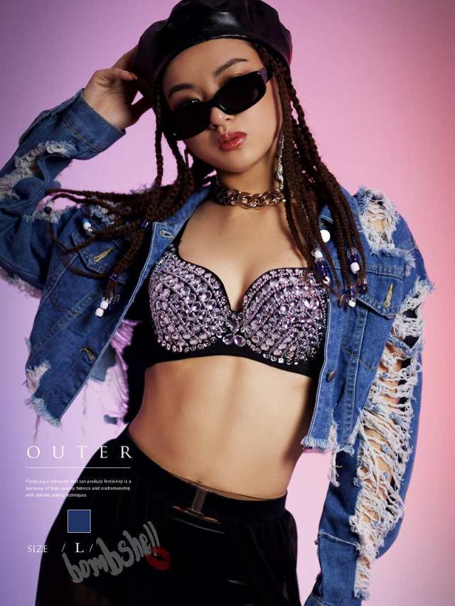 ☆切りっぱなしのハードなクラッシュ加工がCOOLな印象でダンス衣装としても映えるアウター。