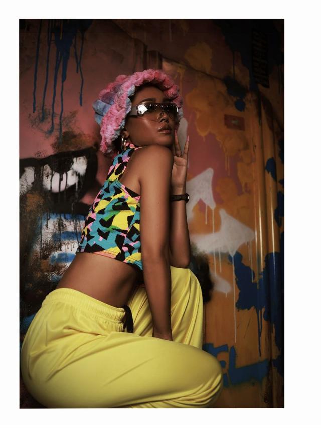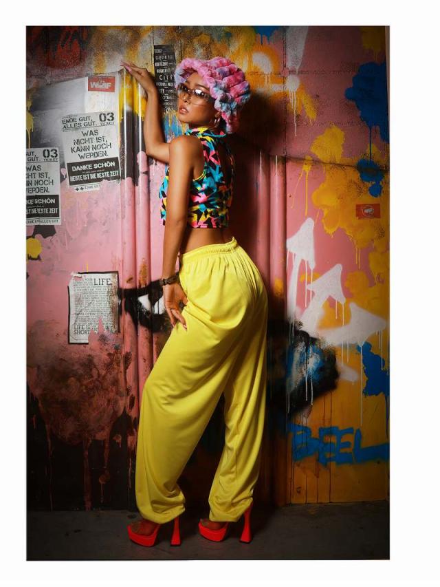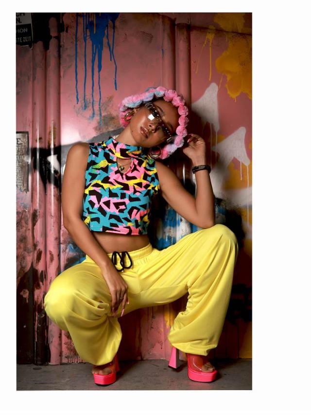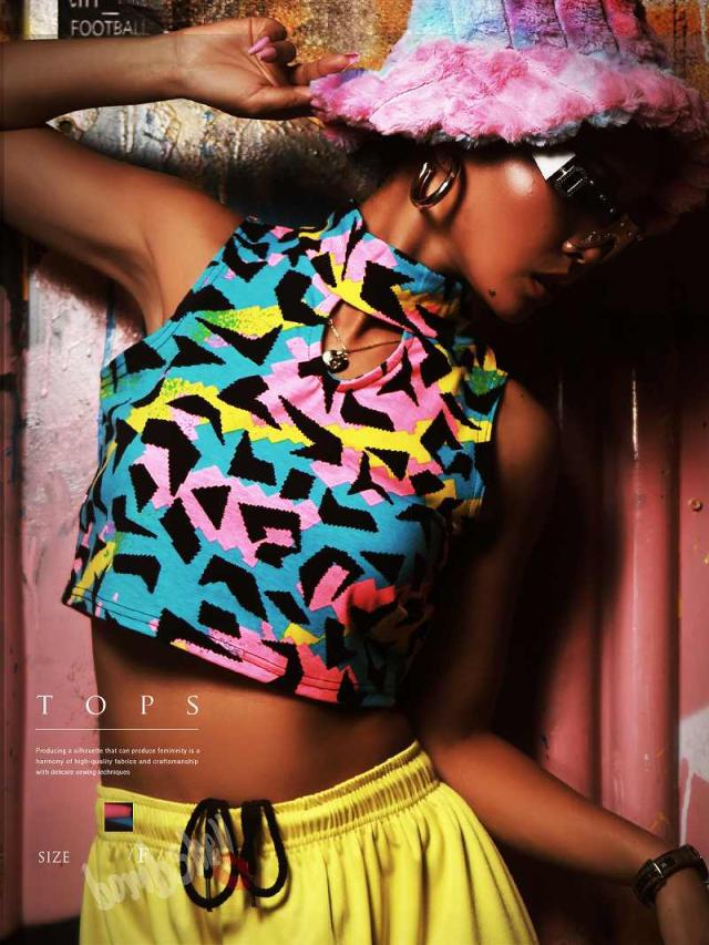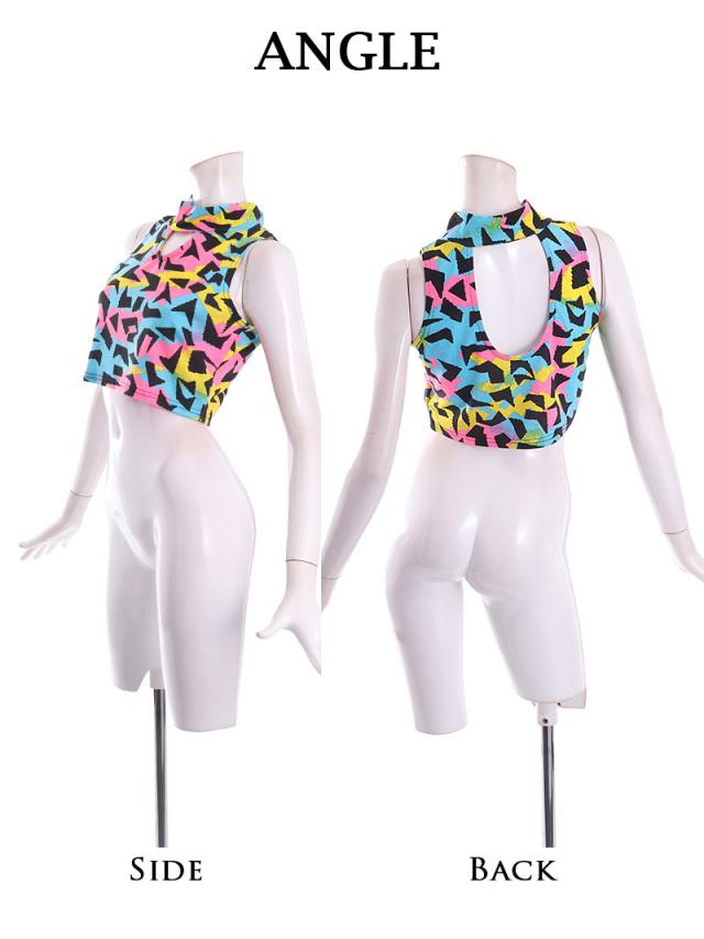 ☆ド派手に目立つPOPカラーの派手柄ミニ丈トップスは、背中あきタンクトップだからセクシーに肌見せも叶う♪