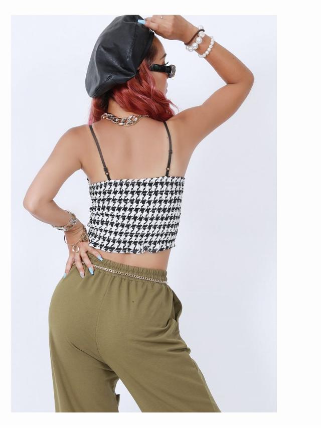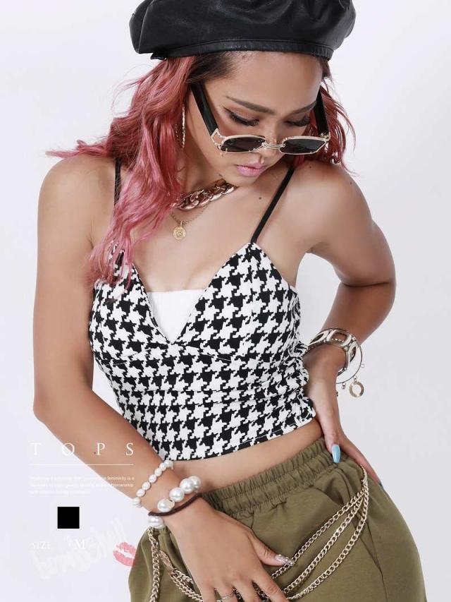 ☆モノトーンカラーの千鳥柄ビスチェ風キャミは、ちらりと見えるお腹魅せがセクシーなキャミソール。