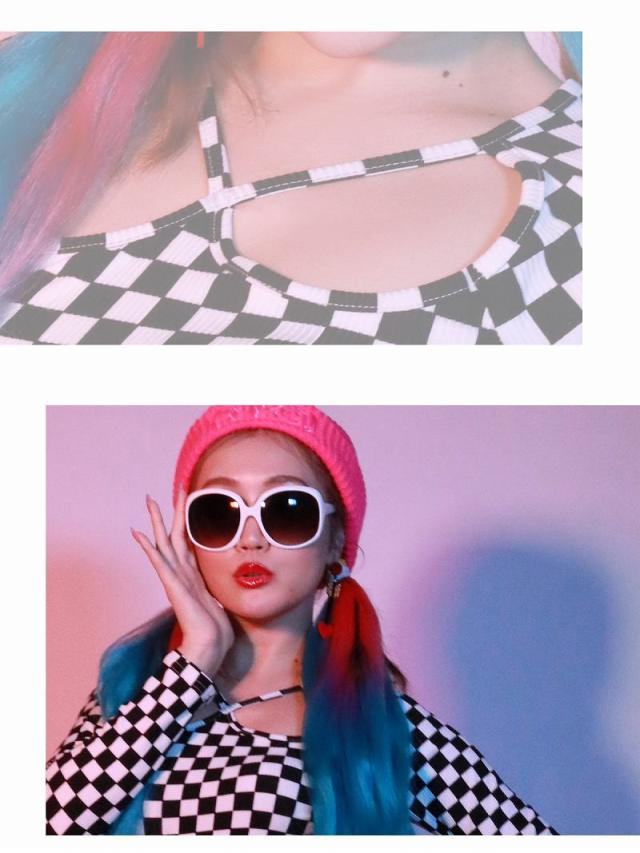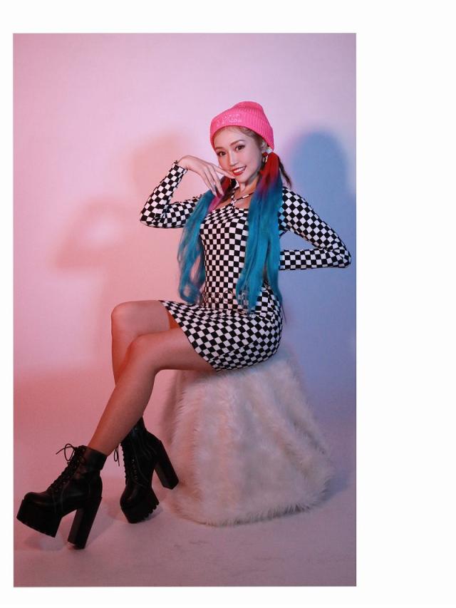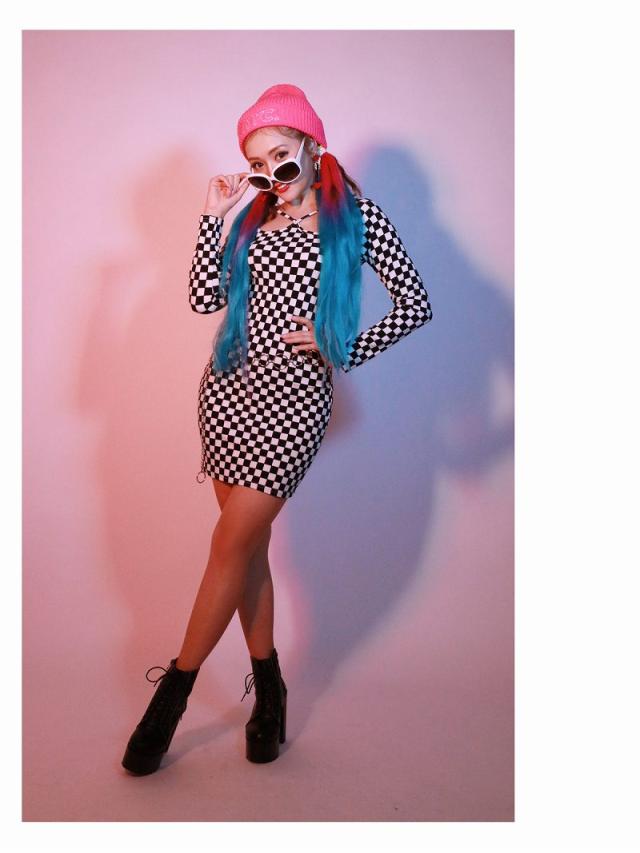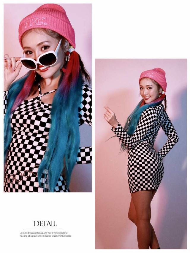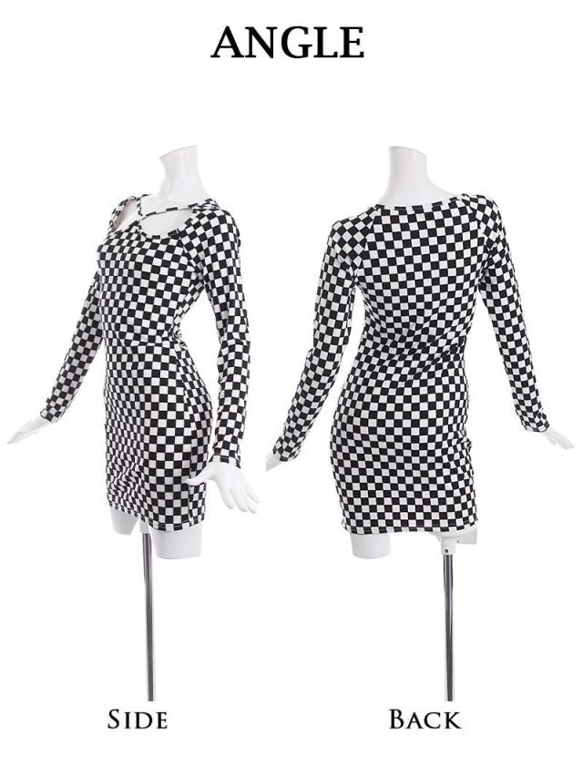 ☆モノトーンのチェッカー柄がインパクト絶大なニットワンピースは、インポートならではのひと癖あるバストカットアウトデザインでセクシーさもアピールできちゃうミニ丈ワンピ!