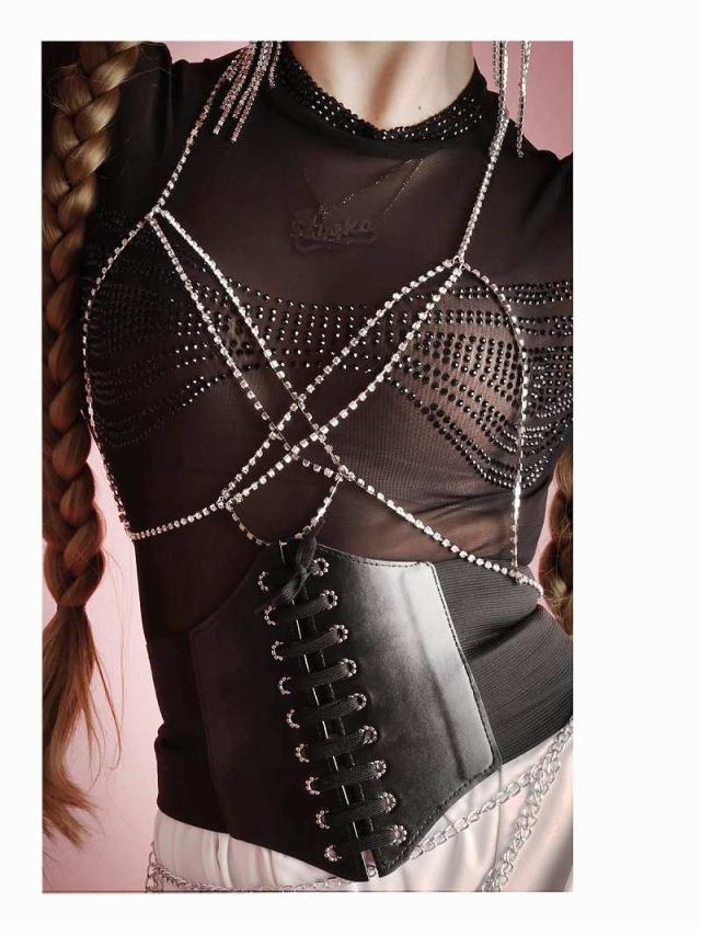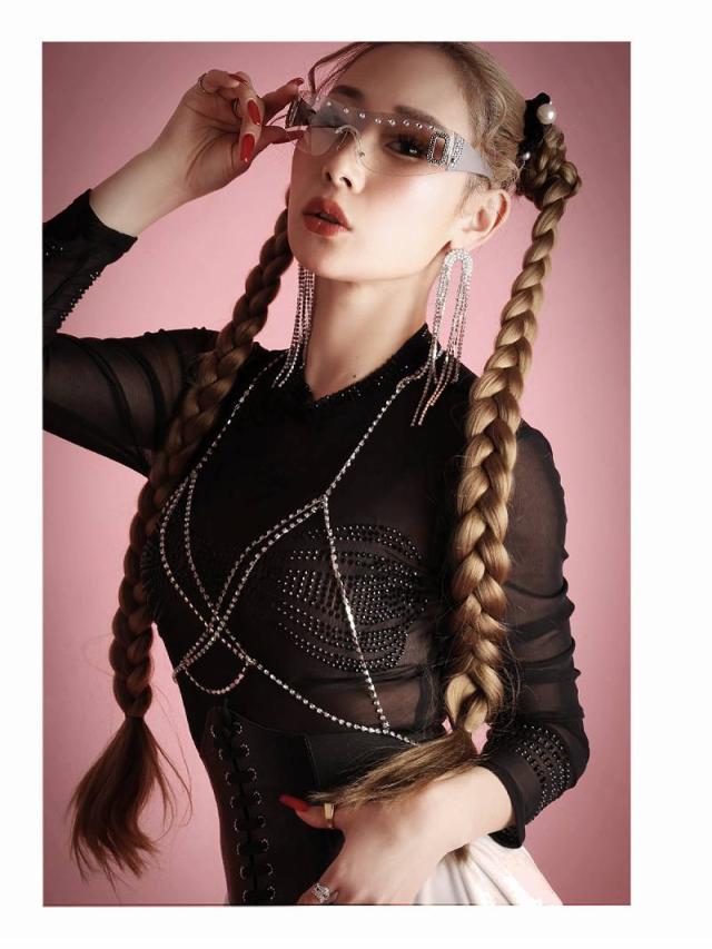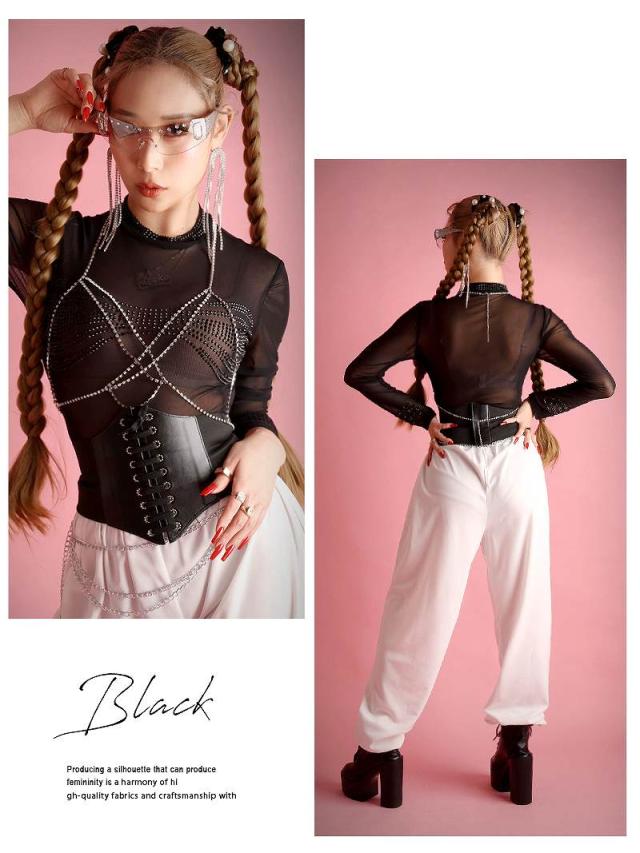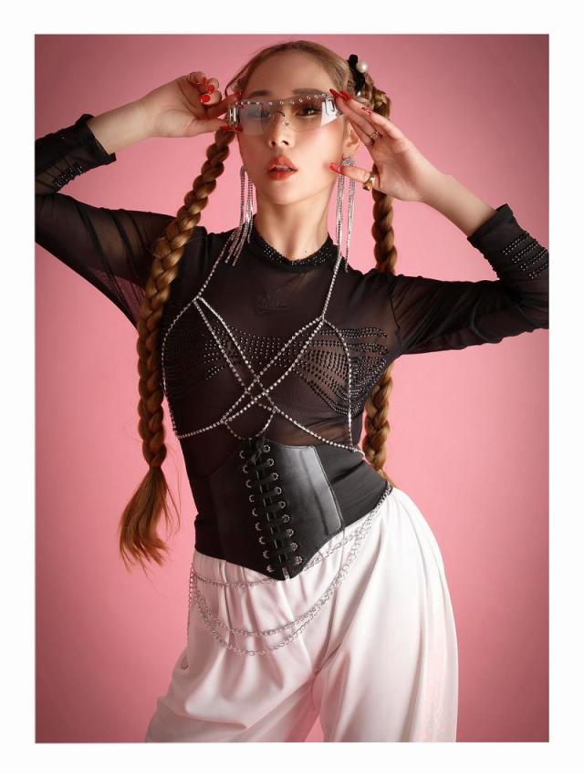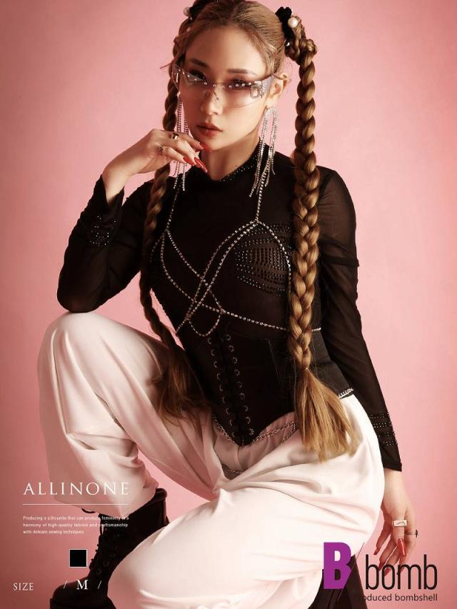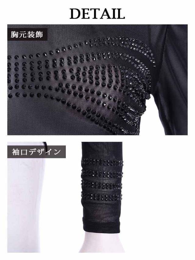 透け感のあるメッシュボディースーツは首元と胸元のビジューが動く度キラキラで美しいトップス。