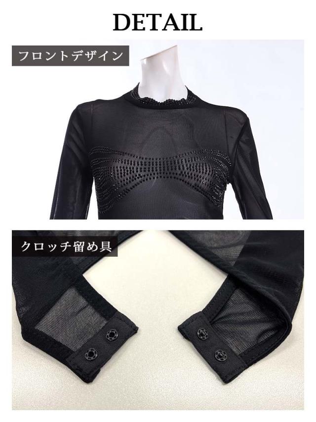 股のクロッチ留めで着脱も簡単なシースルーレオタードはダンサーのステージ衣装にオススメ。