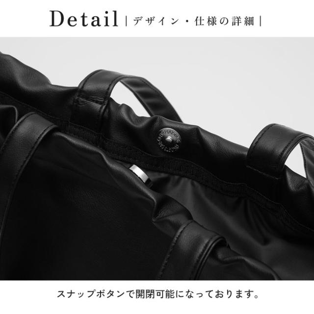 シンプルなデザインながらも大容量なトートバッグ。シンプルさの中にも、口をドローコーデで絞れるデザインなど遊び心のあるアイテムです。マグネットボタンや内ポケットを含め機能性も申し分なし。