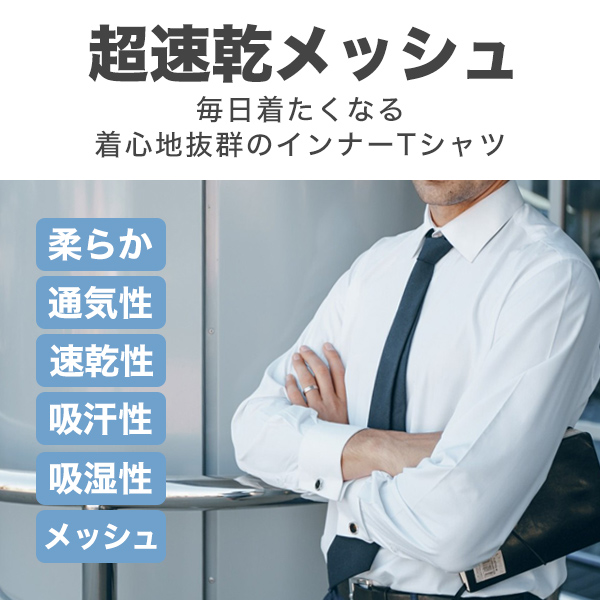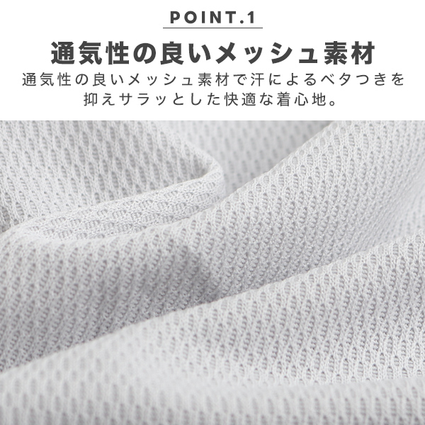 | [商品説明] | <通気性の良いメッシュ素材> 通気性の良いメッシュ素材で汗によるベタつきを抑えサラッとした快適な着心地。 <サラッといつでも快適> 吸水・速乾性に優れ汗をかいても素早く吸収しいつもでサラッと快適な着用感。洗濯後すぐに乾くのも嬉しいポイント。 <オンでもオフでも使える> 日常使いはもちろん、スーツのインナーやスポーツにも使える万能な仕上がり。 |