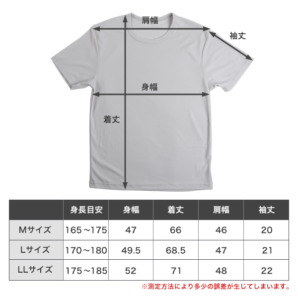 Mサイズ:身幅47/着丈66/肩幅46/袖丈20 Lサイズ:身幅49.5/着丈68.5/肩幅47/袖丈21 LLサイズ:身幅52/着丈71/肩幅48/袖丈22 |