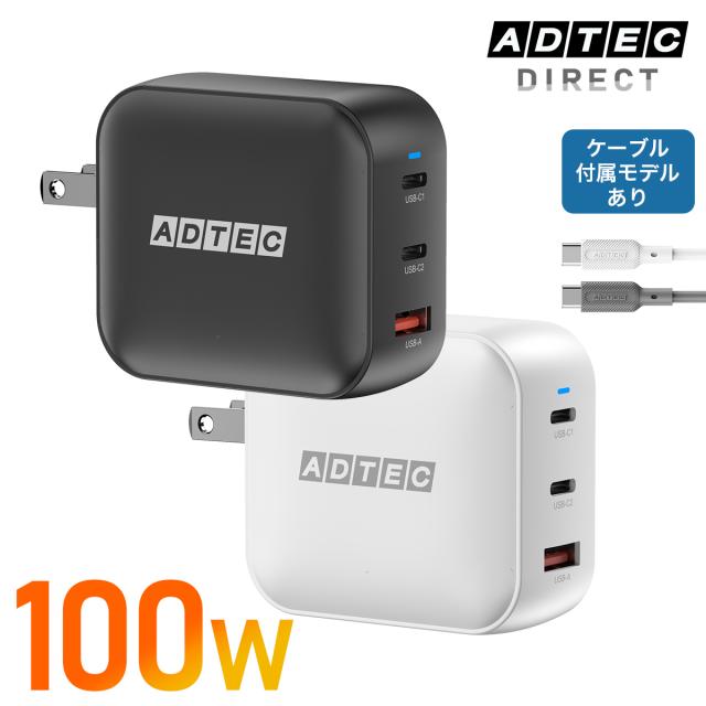 アドテック 100W PD充電器 3ポート(USB-Cx2+USB-A) |Apple MacBook Air Pro/iPhone17 Air Pro/Google Pixel10 Proなど最新ノートPCやスマホ対応 Nintendo Switch対応|タイプCケーブル付属|高出力 小型 コンパクト 高速充電 急速充電 PD 充電器 GaN||APD-V100AC2-SCU2