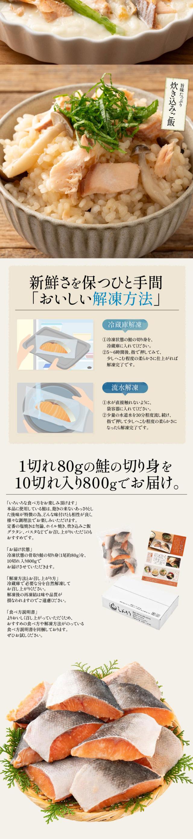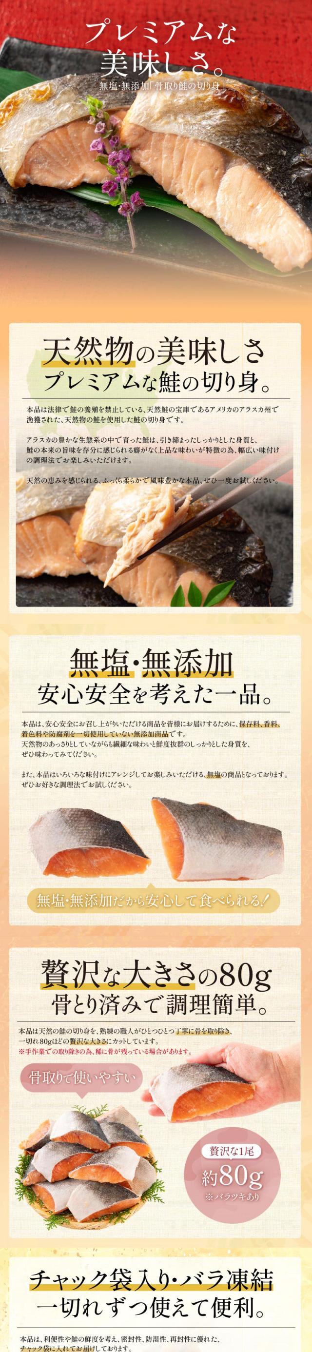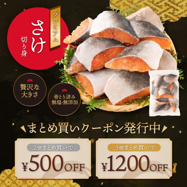 【無添加・無塩】プレミアム 骨取り 鮭 サケ 切り身 大サイズ (80g×10切) 2個購入500円 3個購入1,200円 OFF まとめ買いクーポン付 天然 骨なし チャック袋 バラ凍結 冷凍 グルメ ギフト プレゼント