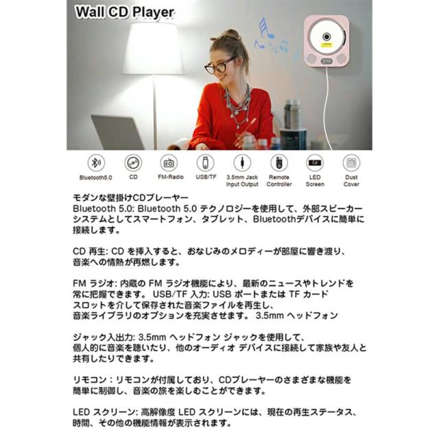 【壁掛けおよびデスクトップ CD プレーヤー】クリエイティブな Kpop スイッチ デザイン (電源コードを引くだけで再生を開始できます)。壁に簡単に取り付けるための壁取り付けキットが付属しています。また、マルチアングル折りたたみデスク スタンドを使用すると、さまざまな場所に設置できます。リビングルーム、ダイニングルーム、ベッドルーム、ジムなどお好きな場所でCDプレーヤーをご利用いただけます。ダストカバーと赤外線リモコンを使用して設計されています(電池は付属しません)。有線CDプレーヤーのためリモコンでは電源が切れませんのでご注意ください。