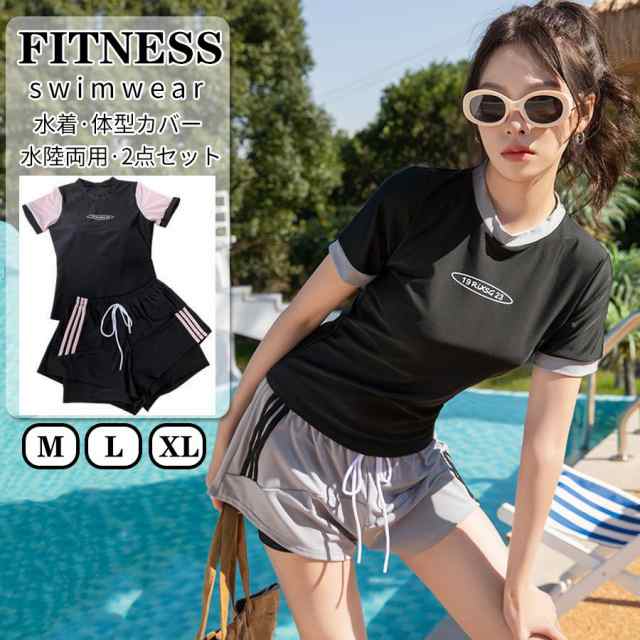 水着 レディース 体型カバー フィットネス水着 韓国風 20代 30代 40代 ママ水着 胸パッド付きおしゃれ かわいい 女性用 2点セット 小胸 盛れる 黒 スクール水着