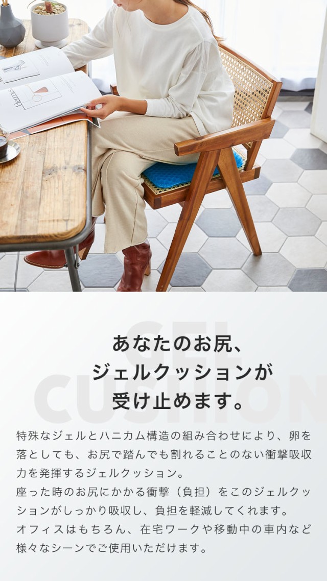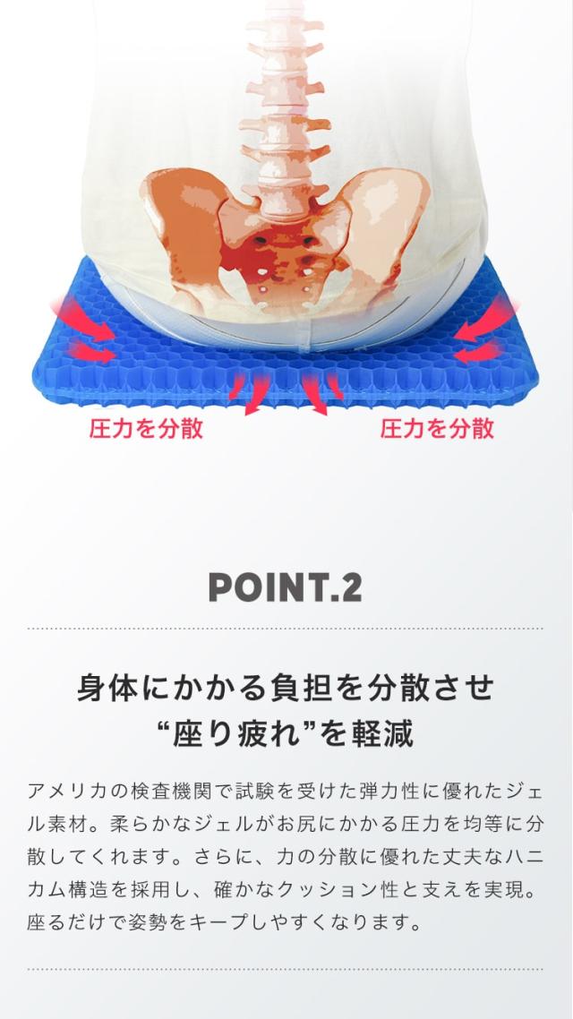 座った時のお尻にかかる衝撃(負担)をこのジェルクッションがしっかり吸収し、負担を軽減してくれます。