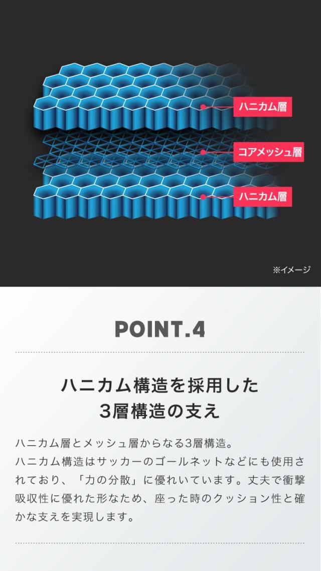 さらに、力の分散に優れた丈夫なハニカム構造を採用し、確かなクッション性と支えを実現。
