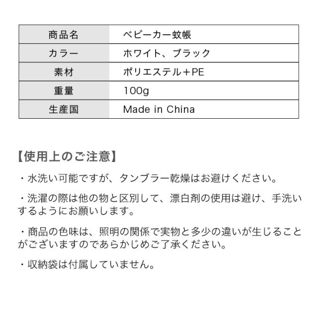 | 【商品説明】 ベビーカー蚊帳は赤ちゃんを害虫や日差しから守ります。 スプレータイプの虫除けとは違い、赤ちゃんの肌に対する心配がありません。 お散歩からレジャーまで、様々なシーンで虫除け対策! ベビーカーでのお出かけに活躍するカバーです。 【水洗い可】水で洗うことができ、繰り返し使用可能です。風通しが良いメッシュ生地です。 【装着簡単】カバーは伸縮性が良く、特殊な形のものを除いて、ほとんどのベビーカーモデルに使用できます。 ダブルファスナー付で開閉が可能なのでお子様の乗り降りもスムーズにできます。 ※対面式のベビーカーには適していません。 【サイズ】 縦43cm×横70cm(ベビーカー装着時:縦約43cm×横約100?120cm) 【カラー】 ホワイト/ブラック 【重 量】 100g 【素 材】 ポリエステル+PE |