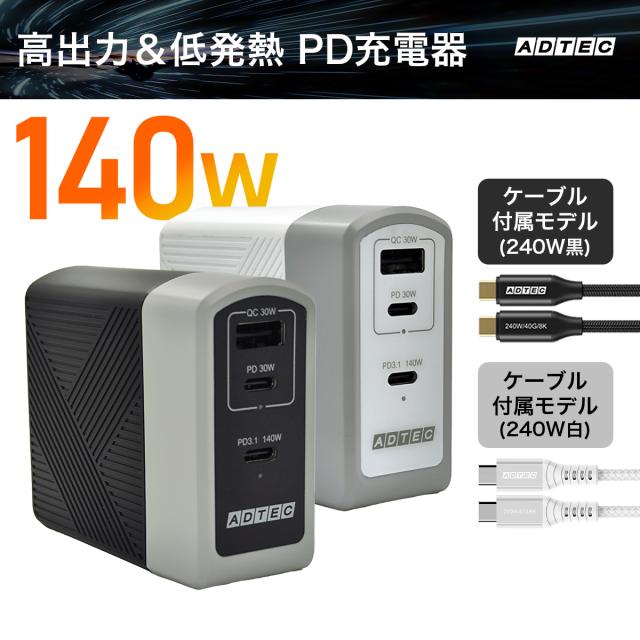 アドテック 140W 高出力PD充電器 |3ポート(USBタイプC×2、タイプA)|タイプCケーブル付属(240W)|【PD3.1/PPS対応】|急速充電 高速充電 GaN採用 コンパクト設計 ノートPC・タブレット・スマホ対応|APD-A140AC2-wC24/CU4G3