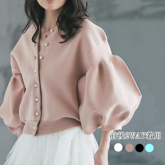 パール付き ニットカーディガン ノーカラー カーディガン ニット カーディガン ボリューム袖 ニットコート 前後2WAY 上品 2024年 秋 韓国服