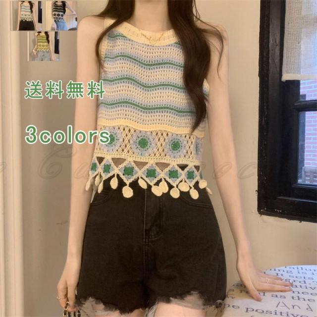 ベスト タンクトップ エスニック ボーダー柄 透かし フリンジ ノースリーブ 重ね着 ショート丈 レディース キャミタンク カジュアル ナチュラル 春 夏