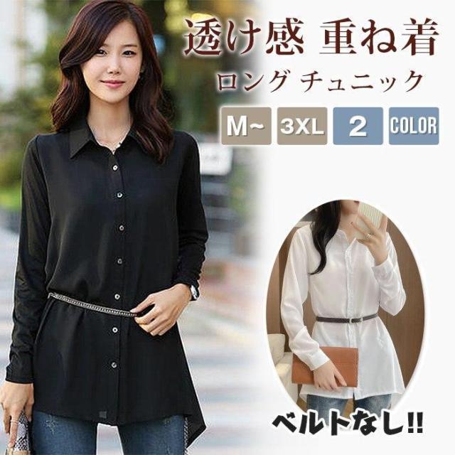 シャツ レディース 長袖 ロング チュニック ロングシャツ 春 夏 秋 冬 ワイシャツ 襟付き aライン 大きいサイズ ゆったり 透け感 重ね着 オーバーサイズ フォーマル オフィス カジュアル ビジネス 大人 OL 無地 黒 ブラック 白 ホワイト