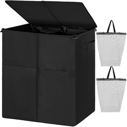 【2つのバスケット】バスケットに分かれており、洗濯の手間を減らし、効率よく衣類を管理できます。以下のように分類できます: 1. 色分け: - **深色衣類**: ブラック、ネイビー、ダークグレーなど、色移りしやすい衣類を入れます - **浅色衣類**: ホワイト、ライトグレー、パステルカラーなど、色移りを防ぐために別にします 2. 乾湿分け: - **乾いた衣類**: 洗濯前に乾燥している衣類を入れます - **湿った衣類**: 洗濯後や汗で湿った衣類を入れます。これにより、湿気による臭いやカビの発生を防ぎます 3. 特別扱い: - **特殊処理が必要な衣類**: ドライクリーニングが必要な衣類や、デリケートな素材の衣類(例:ウールやシルク)を別に分けておきます。