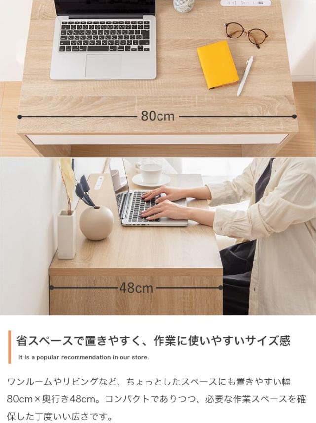 省スペースで置きやすい幅80cm×奥行48cmのコンパクトデスク。