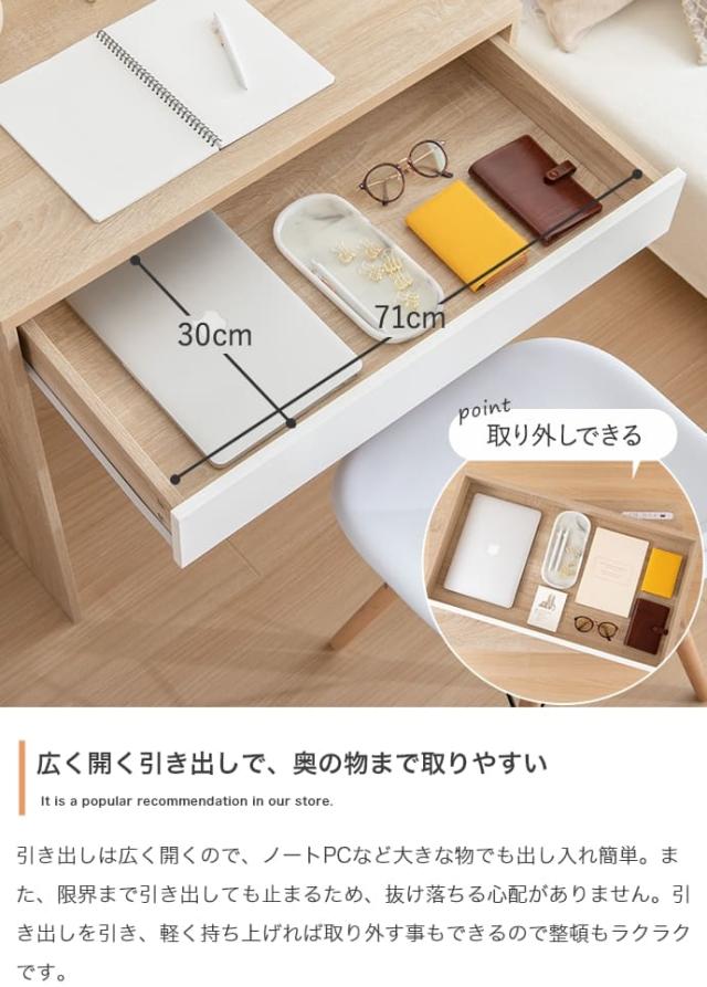 引き出しは天板とほぼ同じ幅で、ノートPCや文房具、小物などの収納に最適。