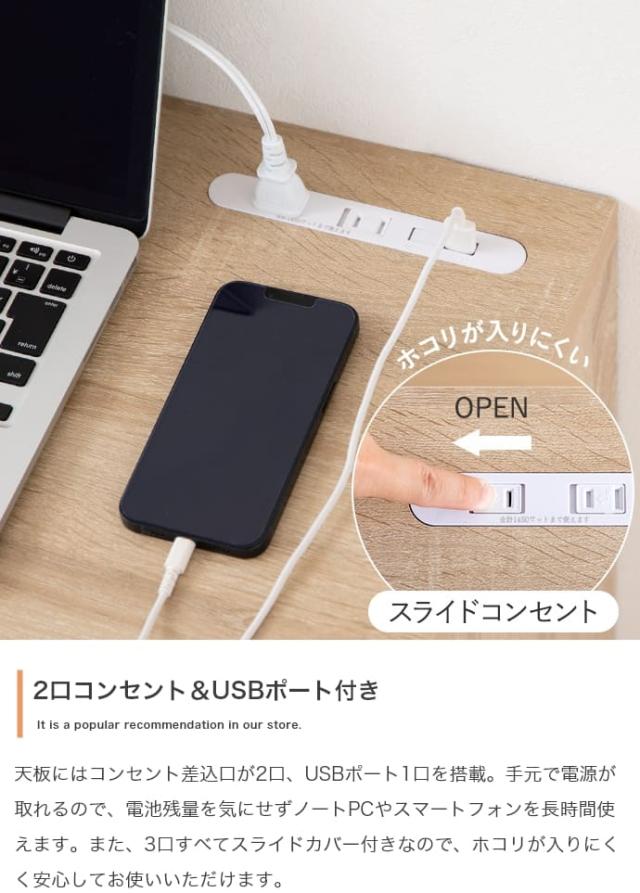 天板には2口コンセントとUSBポートが備わっており、ノートPCやスマホの充電を手元で快適に行えます。