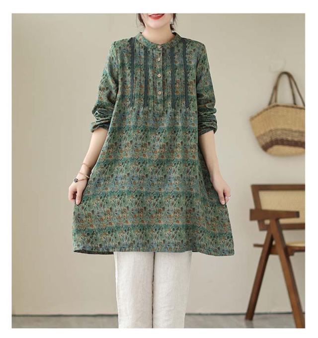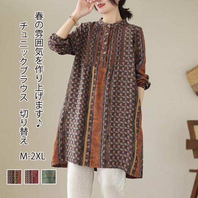 チュニック ブラウス 切り替え チュニックシャツ レディース チュニックブラウス 長袖 立ち襟 花柄 ロングシャツ 綿混 長袖チュニック ボタン タック 総柄 ドッキング ゆったり トップス カジュア
