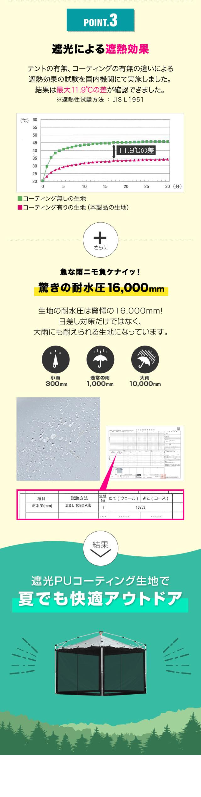 | 耐水圧: 16,000mm ※耐水圧は生地のスペックとしての数値であり、雨の日にトップカバー無しの単体で使用することを想定したものではありません。 |